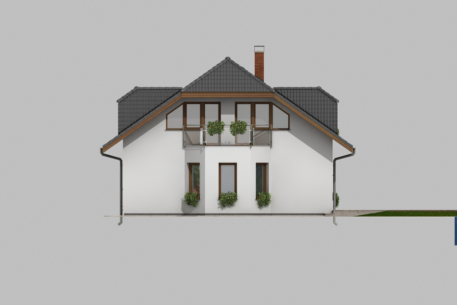 Jednoduchý dům se sedlovou střechou a nápaditým trojúhelníkovým balkonem bude vypadat půvabně na venkově i v menším městě. Čtyřčlenná rodina v něm najde praktické a úsporné bydlení s potřebným zázemím. Vzhledem k malé zastavěné ploše postačí malý pozemek a investiční i provozní náklady budou nízké.