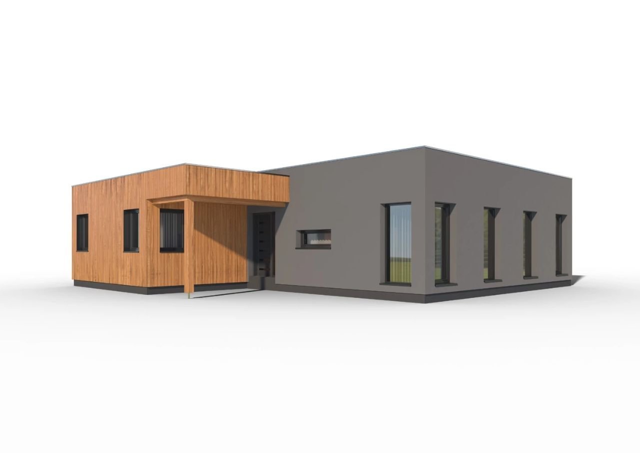 Dům jednoduchého moderního tvaru je určen pro pohodlné bezbariérové bydlení čtyřčlenné rodiny s patřičným zázemím. Má nadstandardně velké zádveří a společný obývací prostor v oblíbeném tvaru L. Ke kladům patří i pohodlná rodinná koupelna a kryté parkovací stání navazující na vstup do domu.