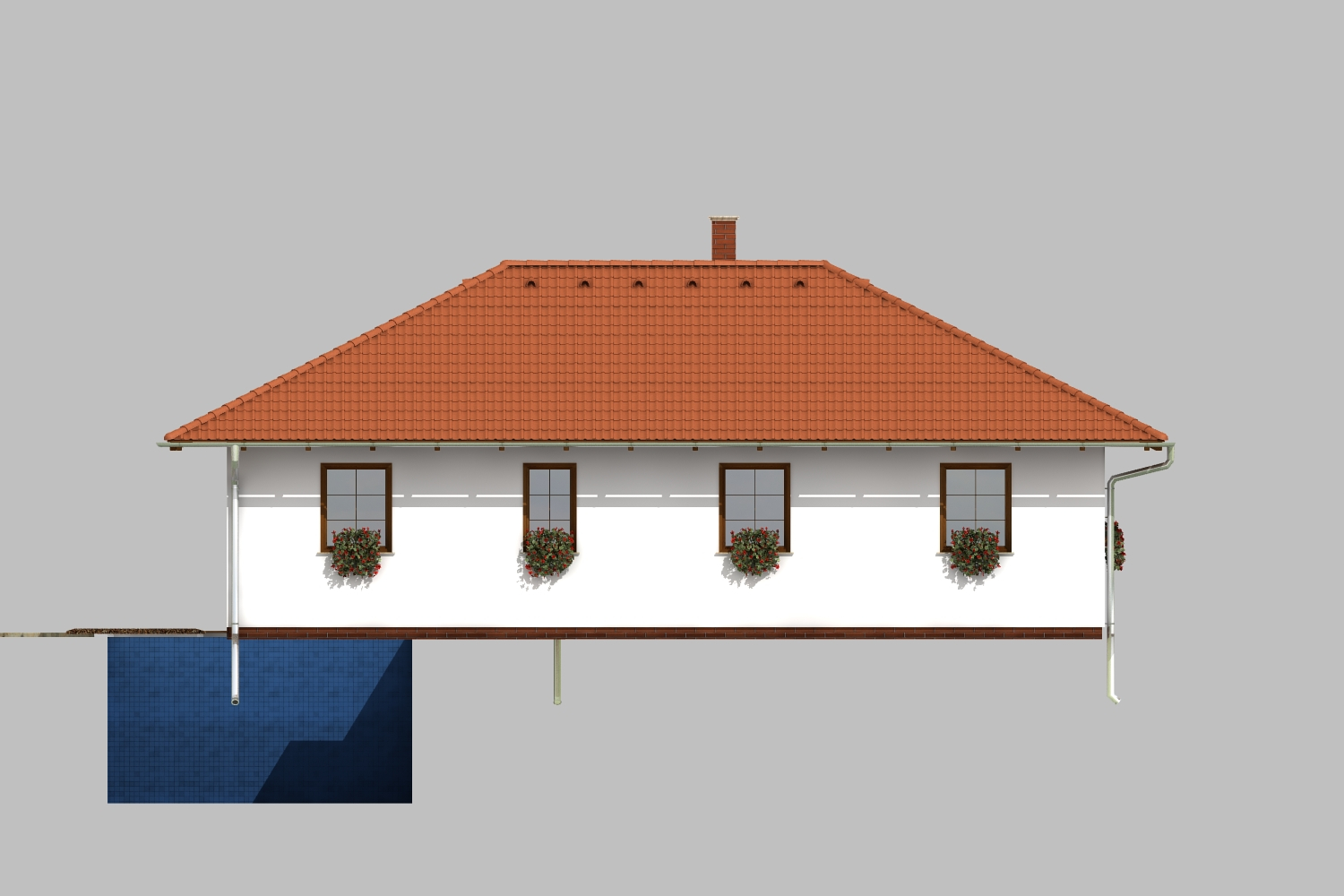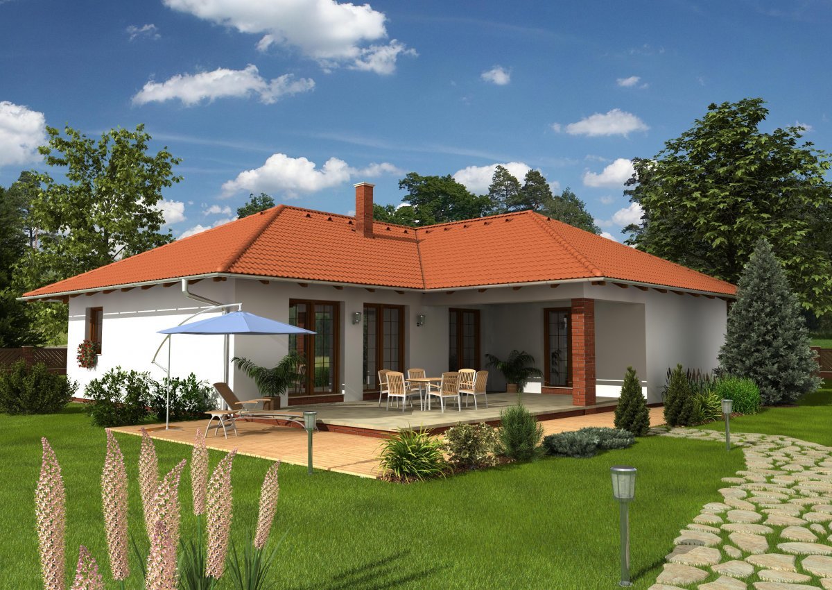 Jedna z mnoha verzí oblíbeného domu na půdorysu písmene L s valbovou střechou a rohovou terasou – bungalov pro čtyřčlennou rodinu. Nabízí účelnou bezbariérovou dispozici, přehledně rozdělenou na denní a ložnicovou zónu. Nejatraktivnější částí domu je velký společný obývací prostor s atypicky řešenou kuchyní. K výhodám domu patří i integrovaná garáž.