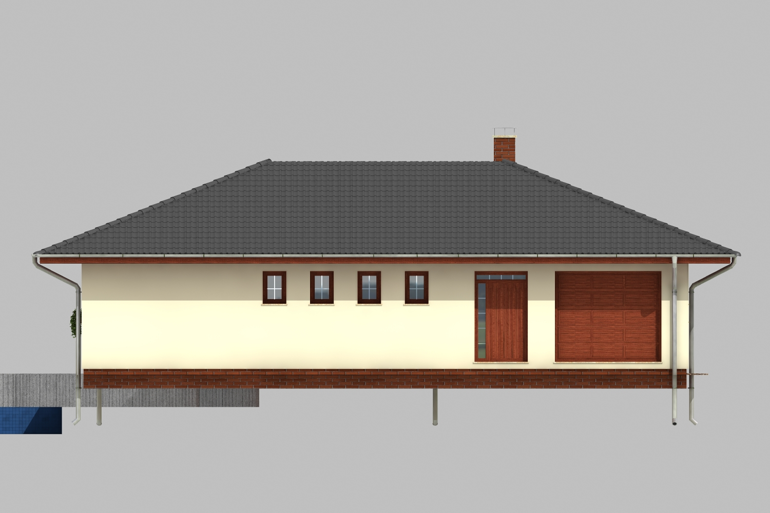 Jedna z mnoha verzí oblíbeného domu na půdorysu písmene L s valbovou střechou a rohovou terasou – bungalov pro čtyřčlennou rodinu. Nabízí účelnou bezbariérovou dispozici, přehledně rozdělenou na denní a ložnicovou zónu. Nejatraktivnější částí domu je velký společný obývací prostor s atypicky řešenou kuchyní. K výhodám domu patří i integrovaná garáž.