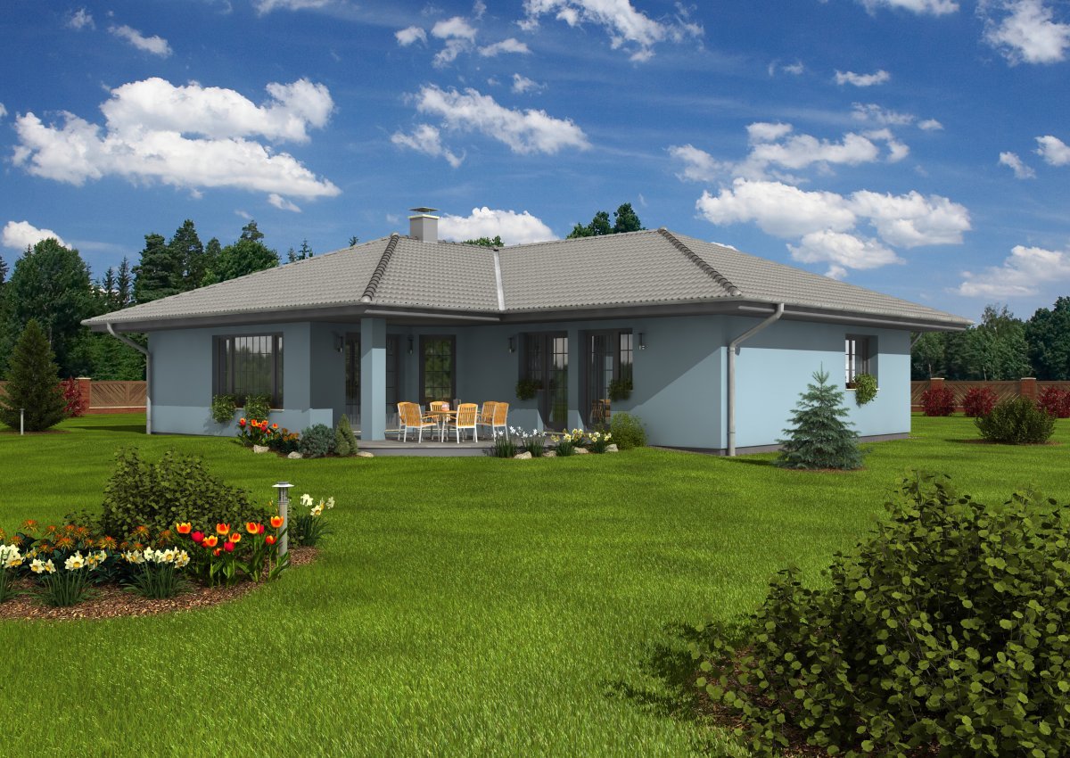 Klasický bezbariérový bungalov pro pohodlné a praktické bydlení čtyřčlenné rodiny. Dispozice je přehledně rozdělena na společnou denní a ložnicovou část, má velkou, částečně oddělenou kuchyň a vzdušný obývací pokoj. Výhodou je také krytá terasa a velká rodinná koupelna.