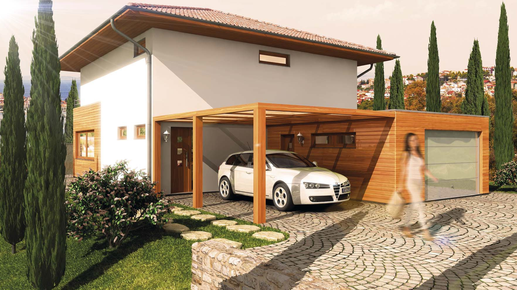 Moderní kompaktní architektura s pultovou střechou bude výrazná v městské i venkovské zástavbě, kde dům vynikne svou výškou. Postačí mu malý pozemek. Na velmi malé zastavěné ploše nabízí praktické a úsporné bydlení pro čtyřčlennou rodinu, pokoje v patře nejsou zmenšeny šikmými stropy jako v běžné podkroví. Ke schodišti je třeba projít přes celý obývací pokoj.