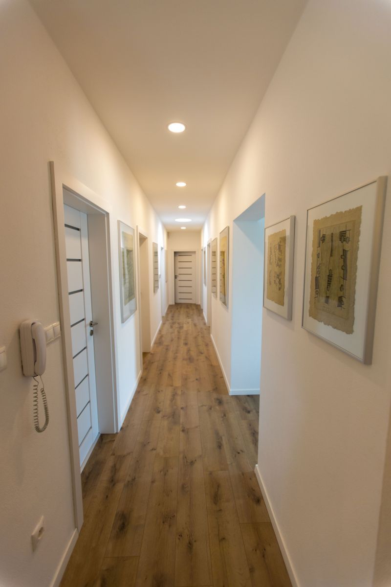 Velkorysý prostor kromě neomezeného pohybu zásadně přispívá světlosti všech místností a tím i příjemnému vnitřnímu prostředí, které přirozeně přechází do exteriéru skrze velká francouzská okna. Ložnice domu jsou přístupné přes chodbu, která tvoří hlukový filtr od obytné části domu. K nim je přiřazena i druhá, hlavní koupelna.