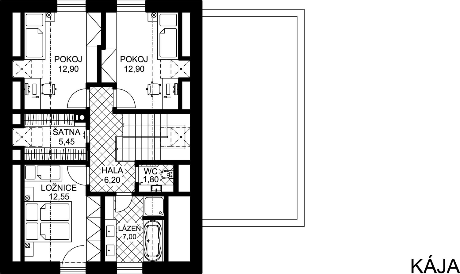 Velkoryse řešený dvoupodlažní dům, který nabídne krásný prostor pro celou rodinu. Svým půdorysným tvarem připomíná písmeno L. Tím je dosaženo utvoření klidného prostoru pro terasu. Velká okna obytných místností a pracovny v 1. NP mohou být orientována na tuto klidnou terasu. Podkroví pak nabídne prostor pro dva velké dětské pokoje, koupelnu, oddělené WC a ložnici se samostatnou koupelnou a šatnou.
