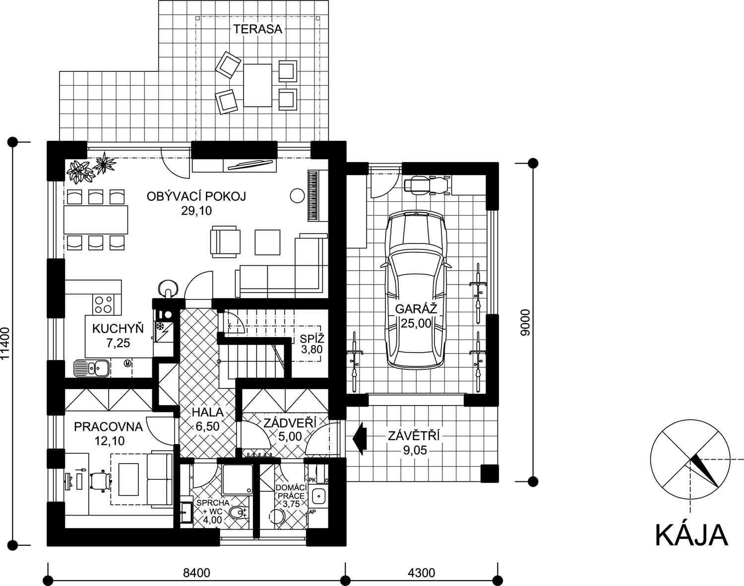 krytý vstup, promyšlená dispozice, společný obývací prostor ve tvaru L, kuchyň částečně opticky oddělená od obývacího pokoje