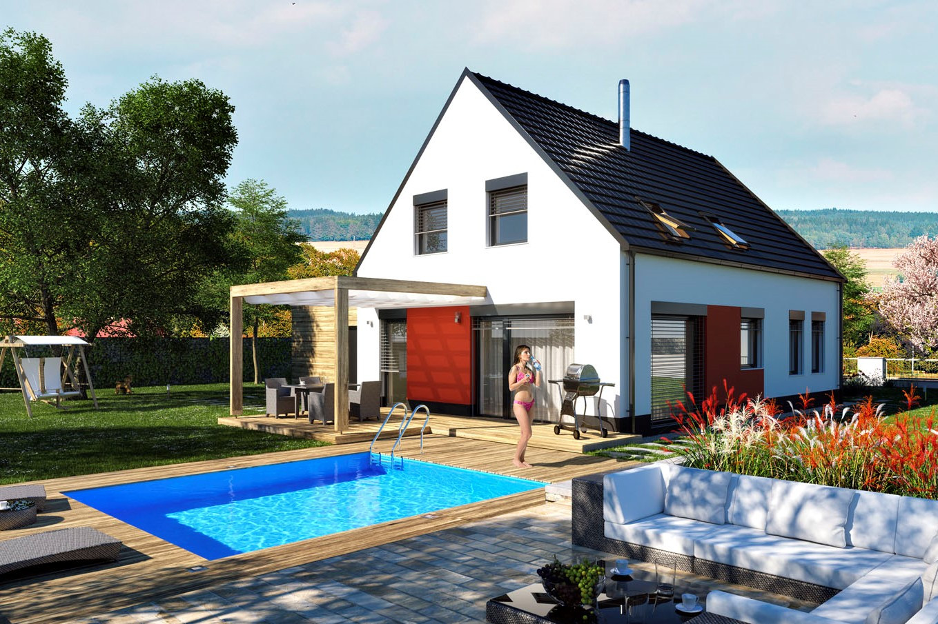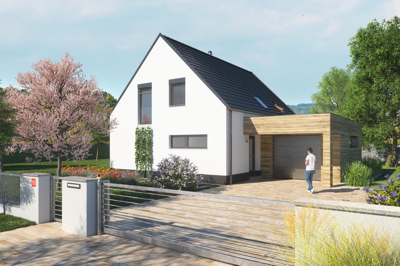 Rodinný dům s obytným podkrovím se sedlovou střechou o sklonu 45° je vhodný jak do městské, tak i vesnické zástavby. Nadčasový jednoduchý tvar bude dobře působit i za desítky let. Součástí domu může být přistavěná garáž s plochou střechou, která vytvoří kryté závětří.