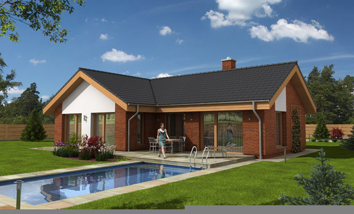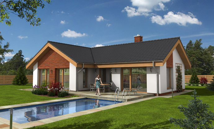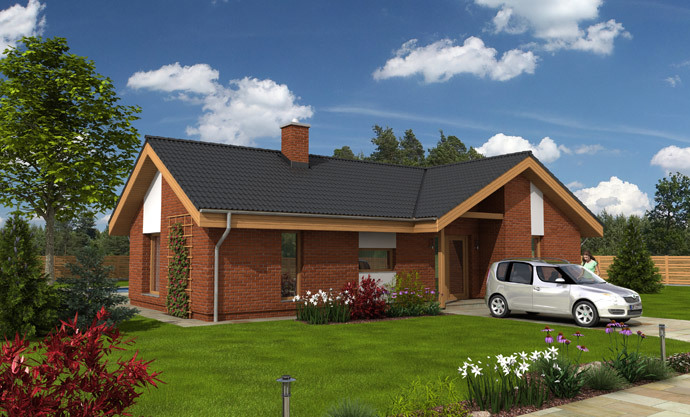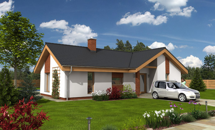 Tento bungalov díky originálnímu řešení střechy vybočuje ze stereotypu a nabízí praktické a zároveň úsporné bydlení tříčlenné rodině nebo dvojici. Bude dobře vypadat ve městě i na venkově. K výhodám patří prostorné zádveří, vyvážená velikost místností, přehledná dispozice, příjemná bude jistě i krytá terasa.