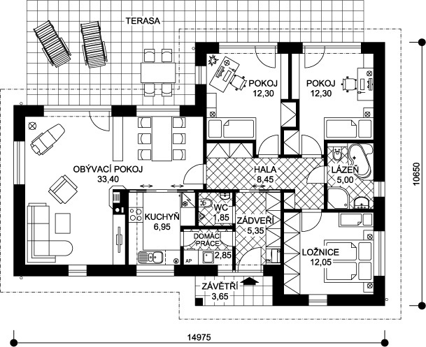Bungalov s charakteristickou valbovou střechou je určen pro praktické a úsporné bydlení čtyřčlenné rodiny. Má přehlednou dispozici, k jeho výhodám patří krytý vstup, krytá terasa, pohodlná kuchyň. Pro rodinu se dvěma dětmi by bylo třeba více úložného prostoru.