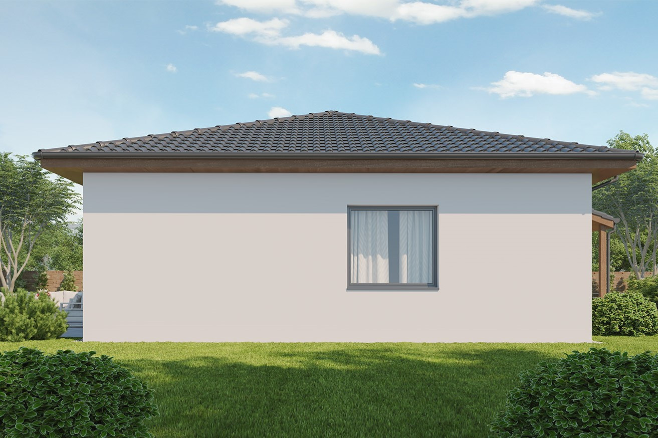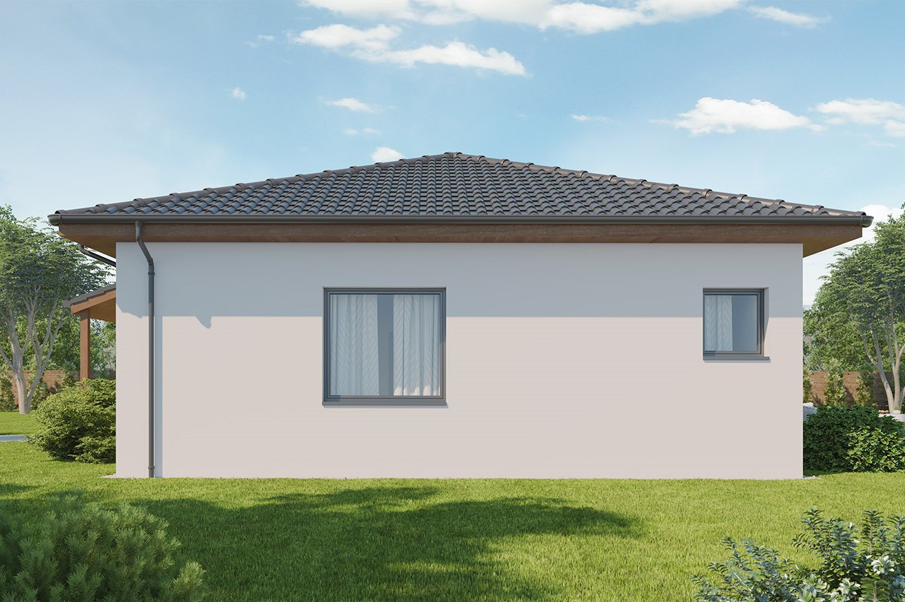 Bungalov s charakteristickou valbovou střechou je určen pro praktické a úsporné bydlení čtyřčlenné rodiny. Má přehlednou dispozici, k jeho výhodám patří krytý vstup, krytá terasa, pohodlná kuchyň. Pro rodinu se dvěma dětmi by bylo třeba více úložného prostoru.