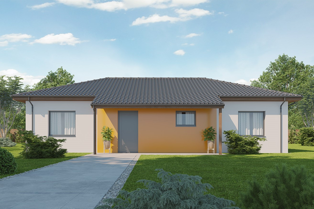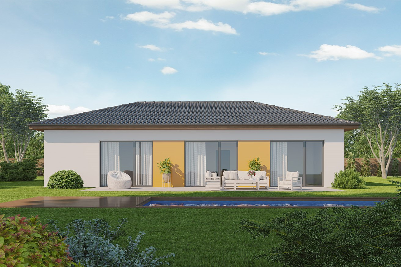 Jednopodlažní dům o dispozici 3 + kk + g je vhodným řešením pro rodiny uvažující o jednom dítěti či jako řešení bydlení na stáří. Dům má půdorys tvaru L, kdy je dispozičně dělen na společenskou a klidovou zónu.