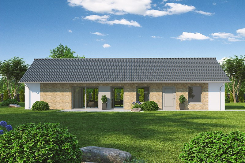 Jednopodlažní dům o dispozici 3 + kk + g je vhodným řešením pro rodiny uvažující o jednom dítěti či jako řešení bydlení na stáří. Dům má půdorys tvaru L, kdy je dispozičně dělen na společenskou a klidovou zónu.