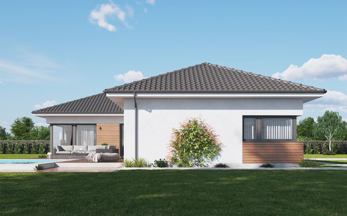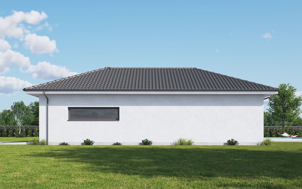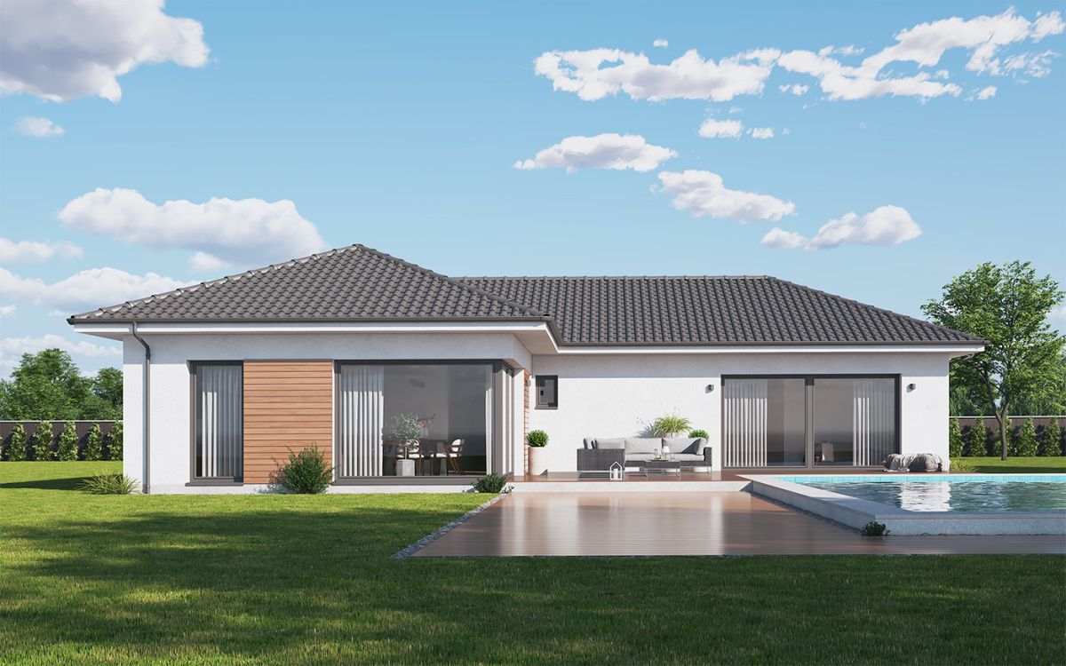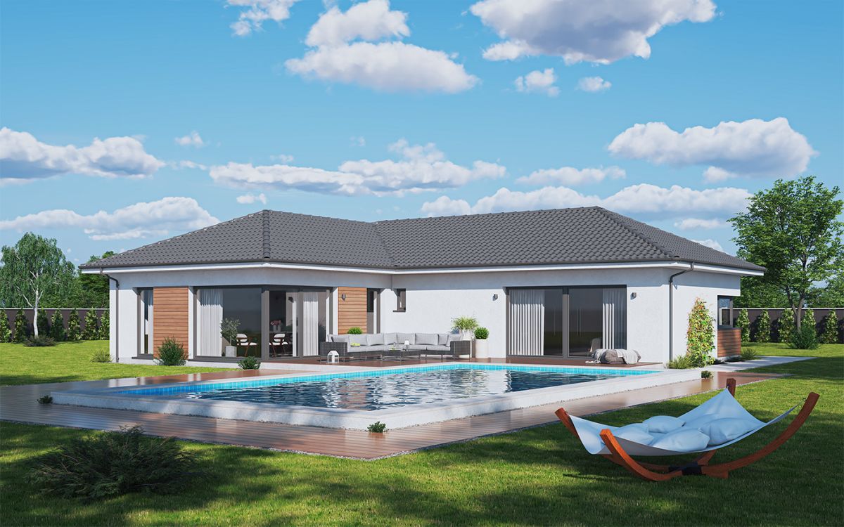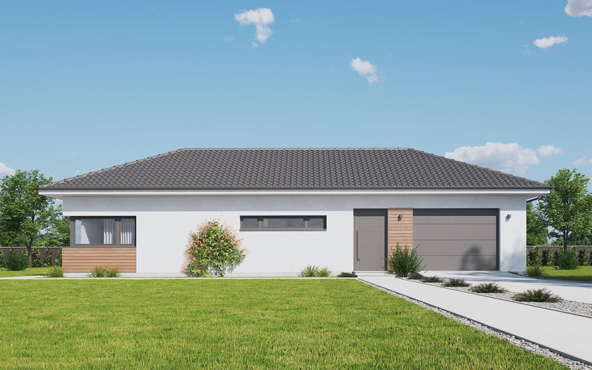 Originální moderní bungalov je vhodný především do nové zástavby a poskytne nadstandardní komfort čtyřčlenné rodině. Architektura zaujme velkým prosklením, zaoblenými nárožími a velkorysým společným obývacím prostorem. Interiér se maximálně propojuje se zahradou, z každého pokoje se dá vyjít přímo ven.
