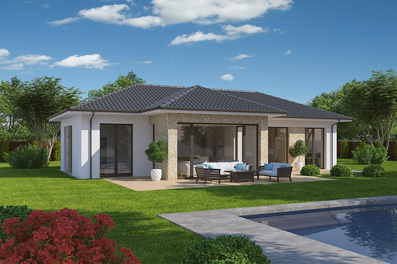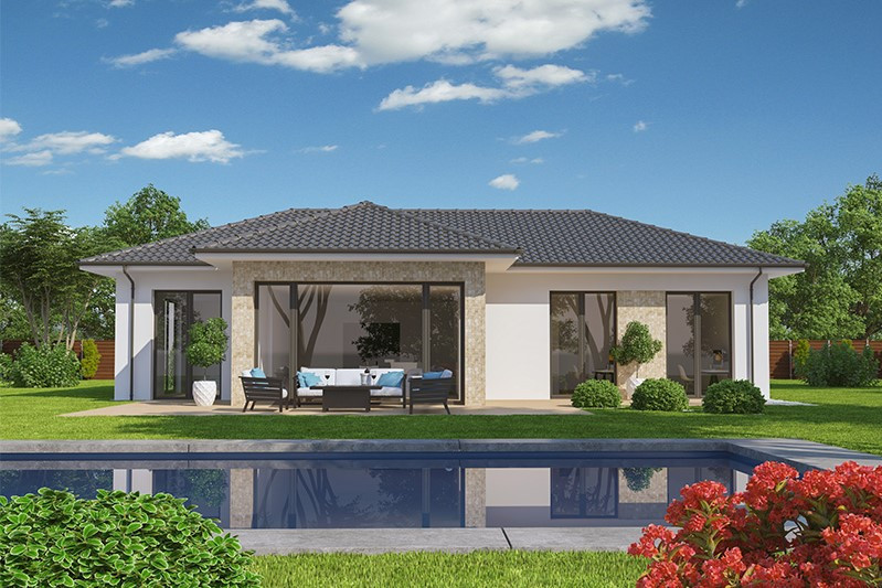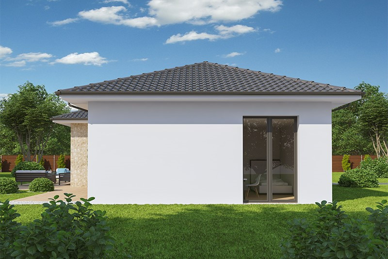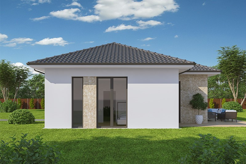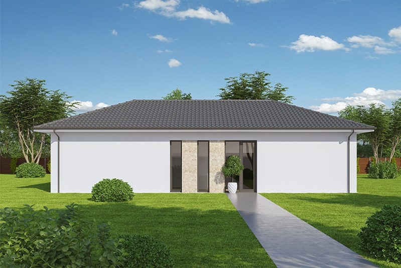 Jednopodlažní dům o dispozici 3 + kk + g je vhodným řešením pro rodiny uvažující o jednom dítěti či jako řešení bydlení na stáří. Dům má půdorys tvaru L, kdy je dispozičně dělen na společenskou a klidovou zónu.