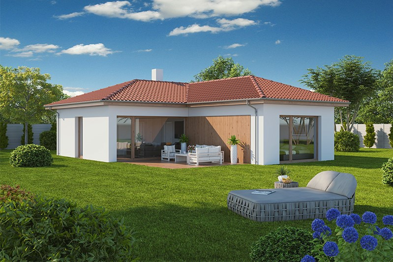 Nadčasový bungalov pro čtyřčlennou rodinu v oblíbeném tvaru L s chráněnou rohovou terasou. Přehledná dispozice maximálně využívá zastav... ěnou plochu a poskytuje úsporné bydlení s bezbariérovým provozem. K přednostem domu patří také velmi výhodný poměr ceny a užitné hodnoty. Nevýhodou je průchozí obývací pokoj.