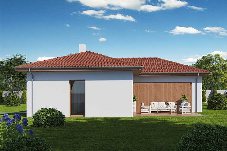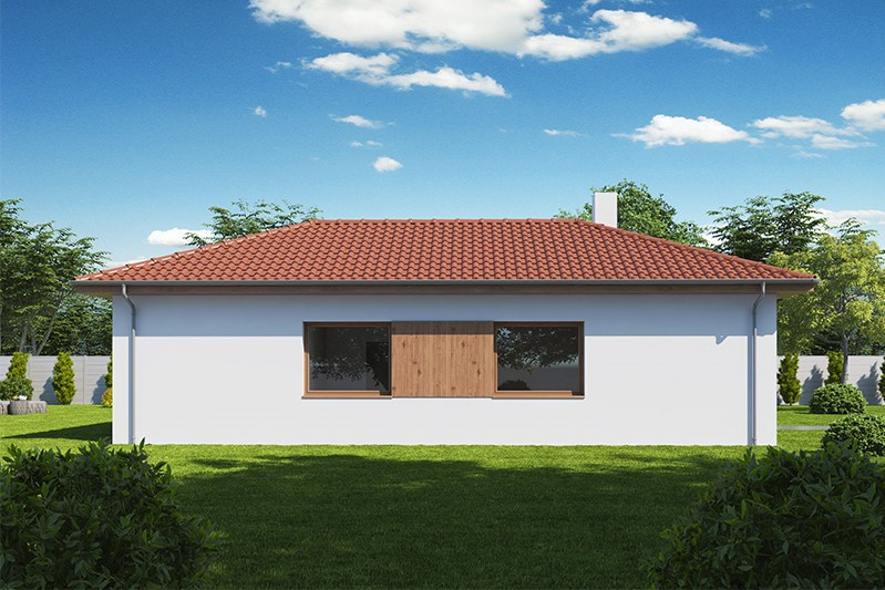 Bungalov s charakteristickou valbovou střechou je určen pro praktické a úsporné bydlení čtyřčlenné rodiny. Má přehlednou dispozici, k jeho výhodám patří krytý vstup, krytá terasa, pohodlná kuchyň. Pro rodinu se dvěma dětmi by bylo třeba více úložného prostoru.