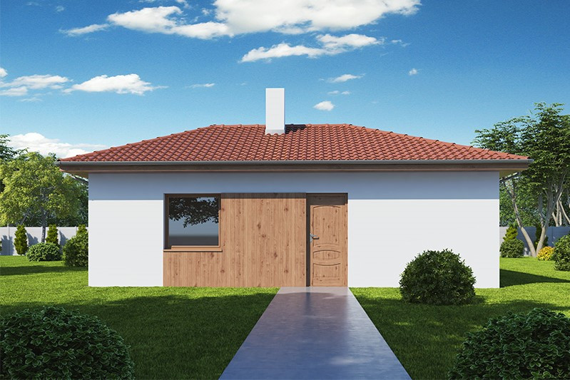Jednopodlažní dům o dispozici 3 + kk + g je vhodným řešením pro rodiny uvažující o jednom dítěti či jako řešení bydlení na stáří. Dům má půdorys tvaru L, kdy je dispozičně dělen na společenskou a klidovou zónu.