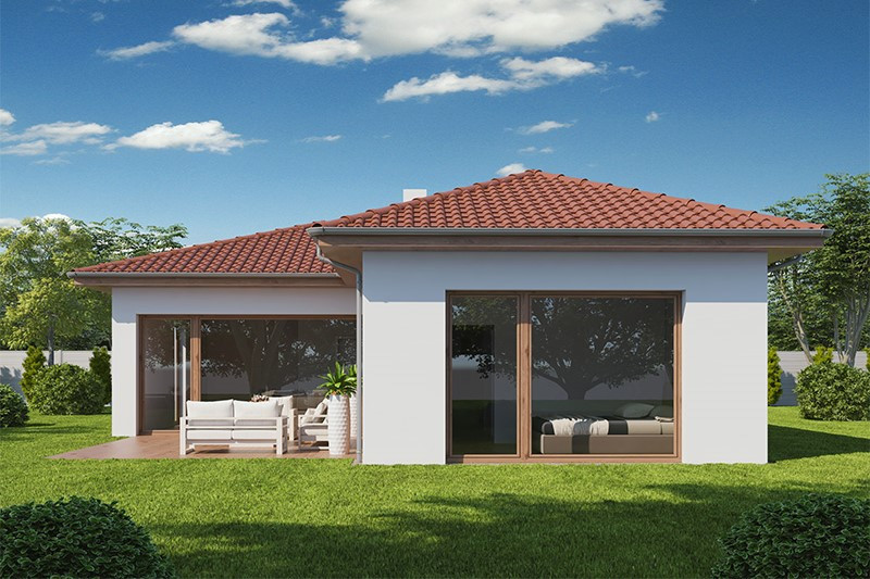 Tento bungalov díky originálnímu řešení střechy vybočuje ze stereotypu a nabízí praktické a zároveň úsporné bydlení tříčlenné rodině nebo dvojici. Bude dobře vypadat ve městě i na venkově. K výhodám patří prostorné zádveří, vyvážená velikost místností, přehledná dispozice, příjemná bude jistě i krytá terasa.