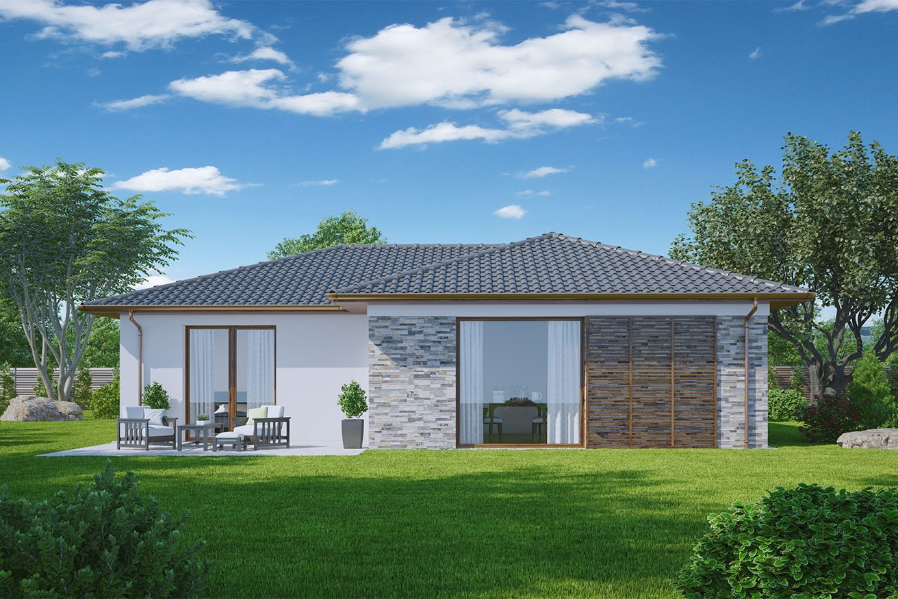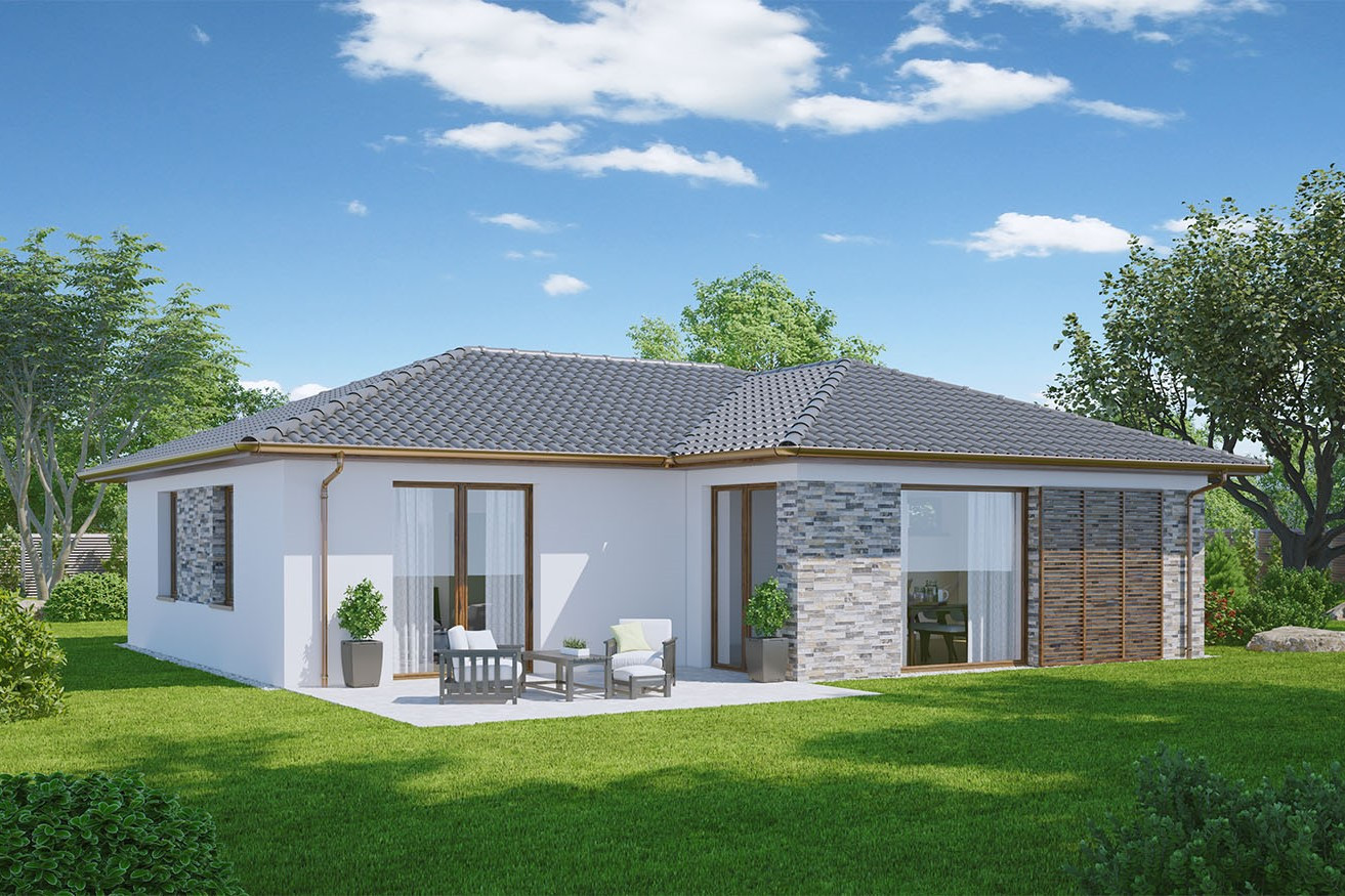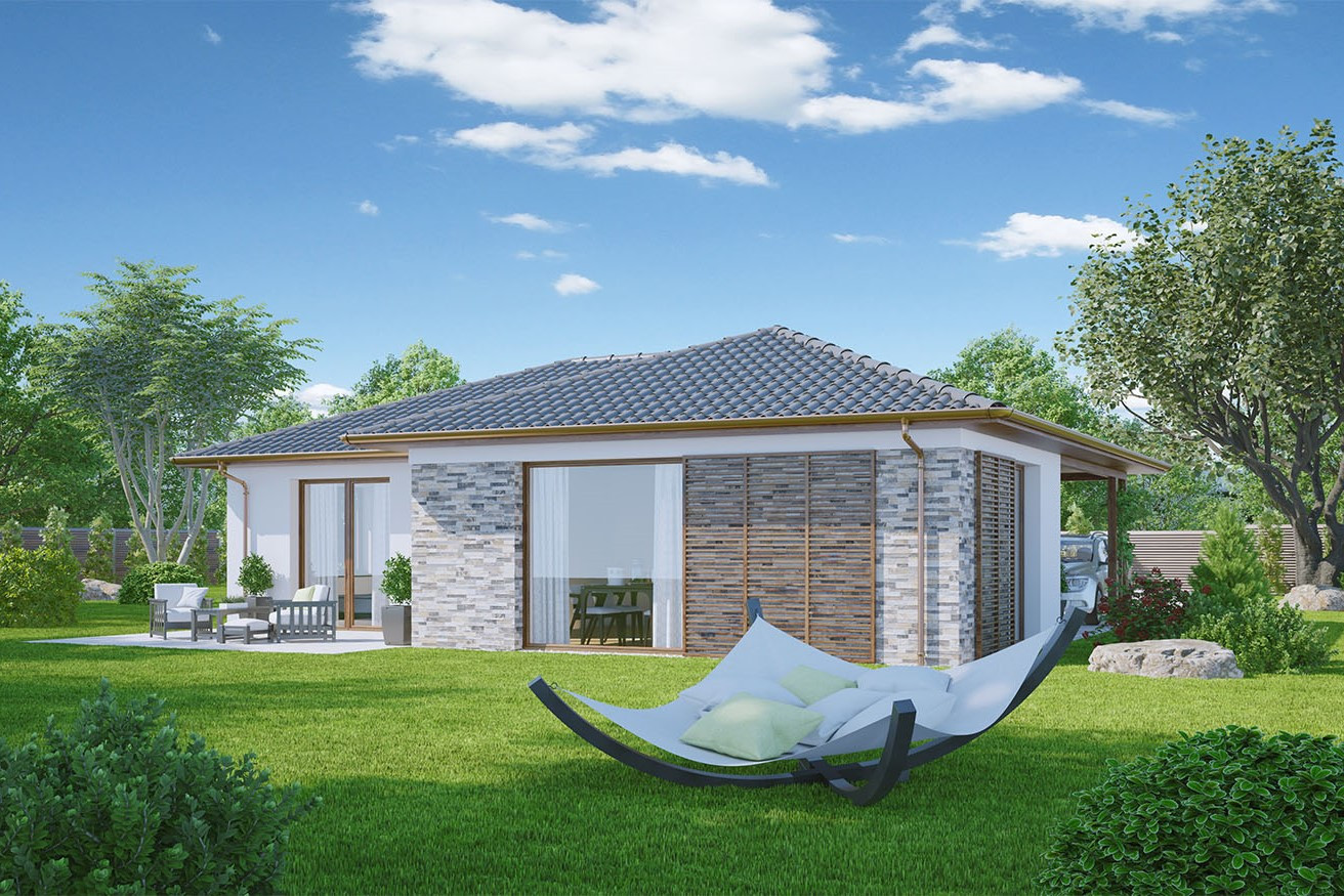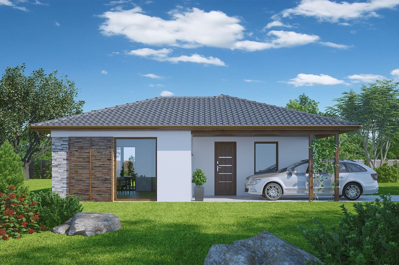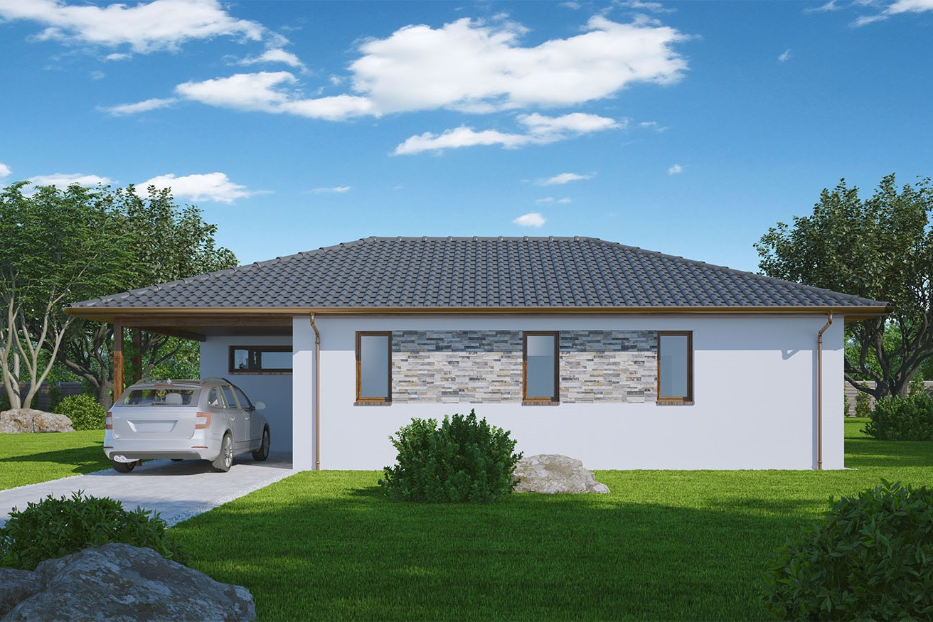 Klasický bungalov s valbovou střechou bude praktickým domovem pro čtyřčlennou rodinu ať už ve městě, nebo na venkově. Má úspornou dispozic... i přehledně rozdělenou na ložnicovou a denní část. K benefitům bude patřit kryté garážové stání a rohová terasa a také příznivá cena.