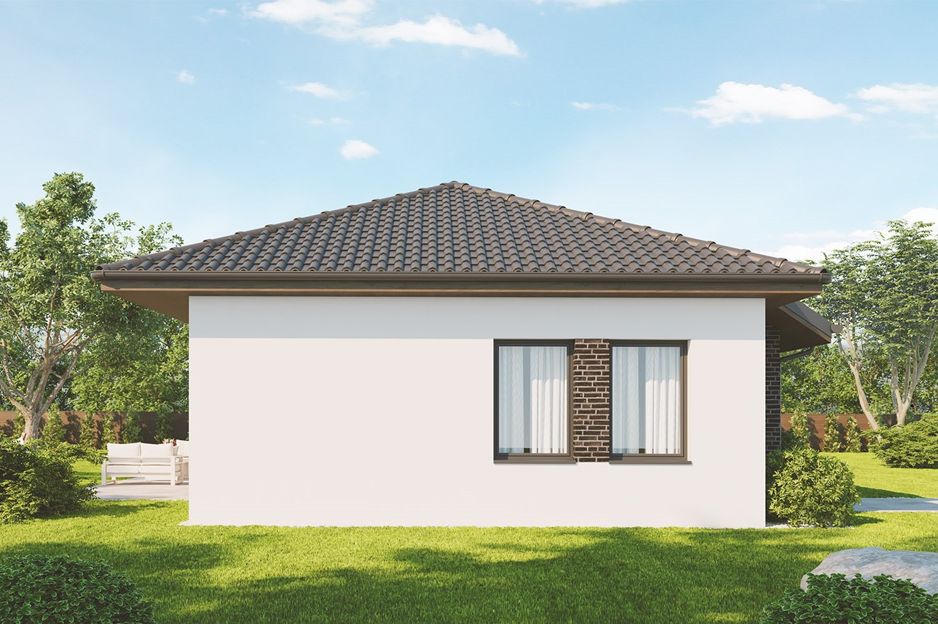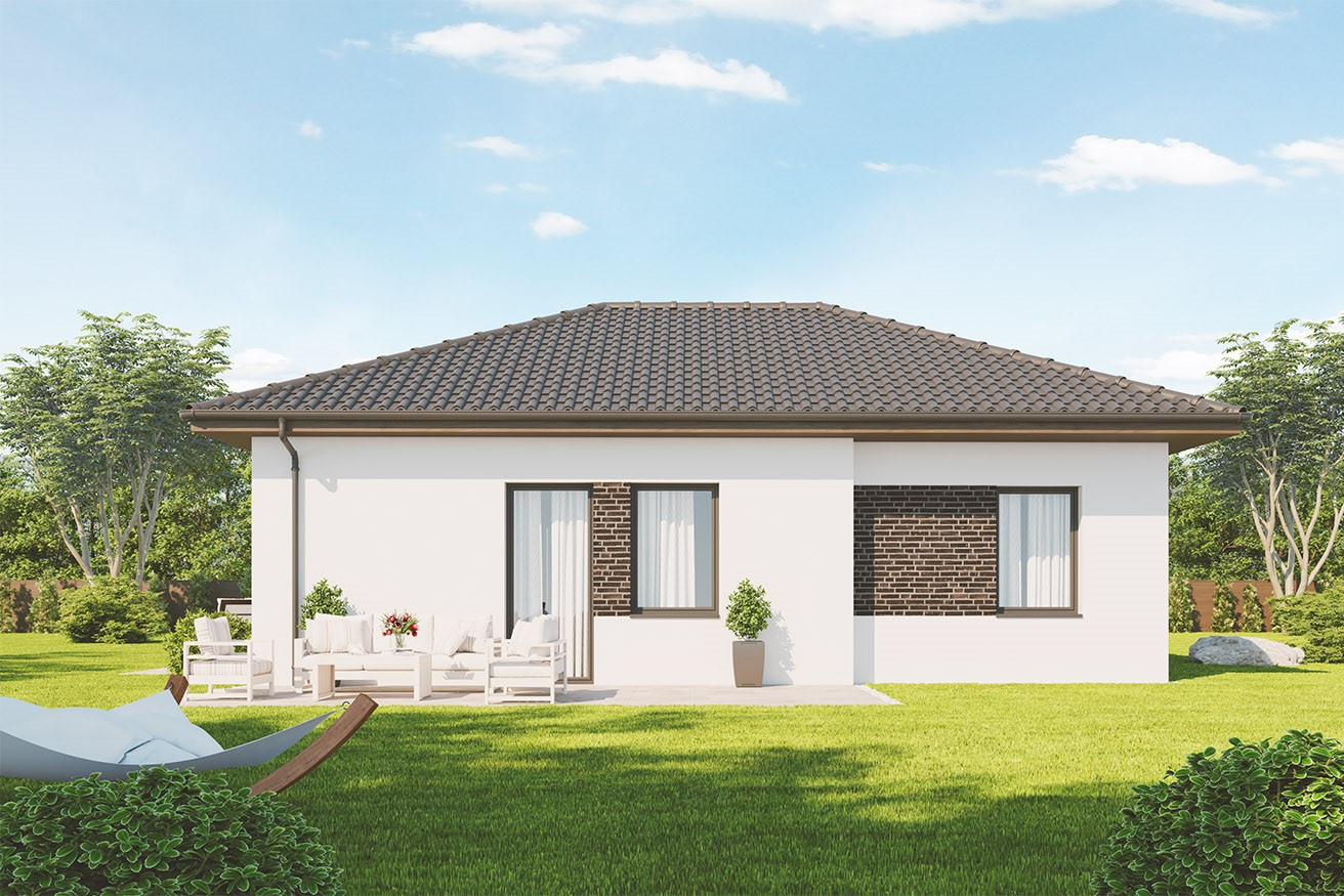 Bungalov s charakteristickou valbovou střechou je určen pro praktické a úsporné bydlení čtyřčlenné rodiny. Má přehlednou dispozici, k jeho výhodám patří krytý vstup, krytá terasa, pohodlná kuchyň. Pro rodinu se dvěma dětmi by bylo třeba více úložného prostoru.