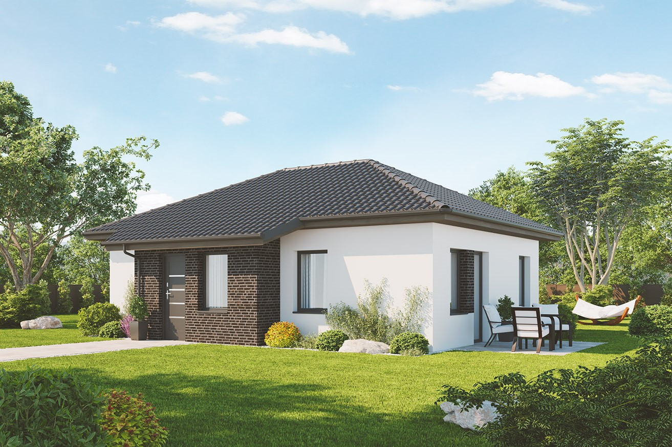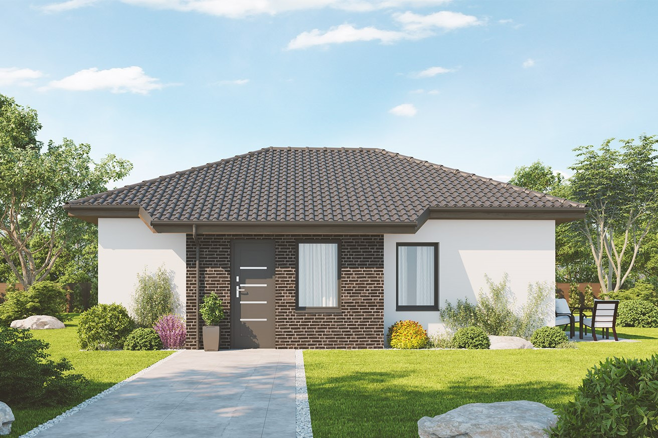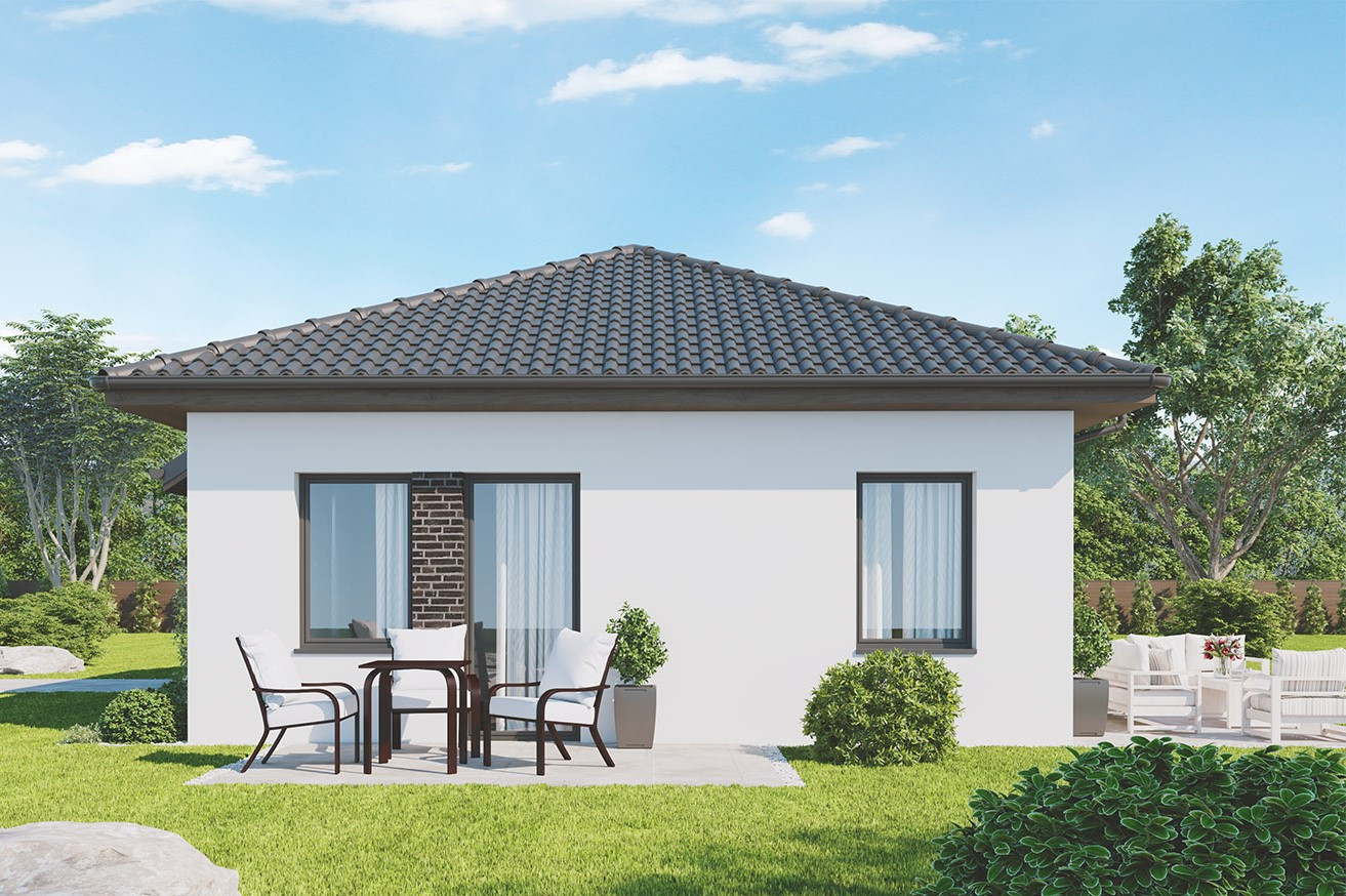 Klasický bungalov s valbovou střechou bude praktickým domovem pro čtyřčlennou rodinu ať už na menším městě, nebo na venkově. Má mal... ou zastavěnou plochu, takže postačí malý pozemek. Kromě úsporné dispozice je jeho výhodou příznivá cena a nízké provozní náklady.
