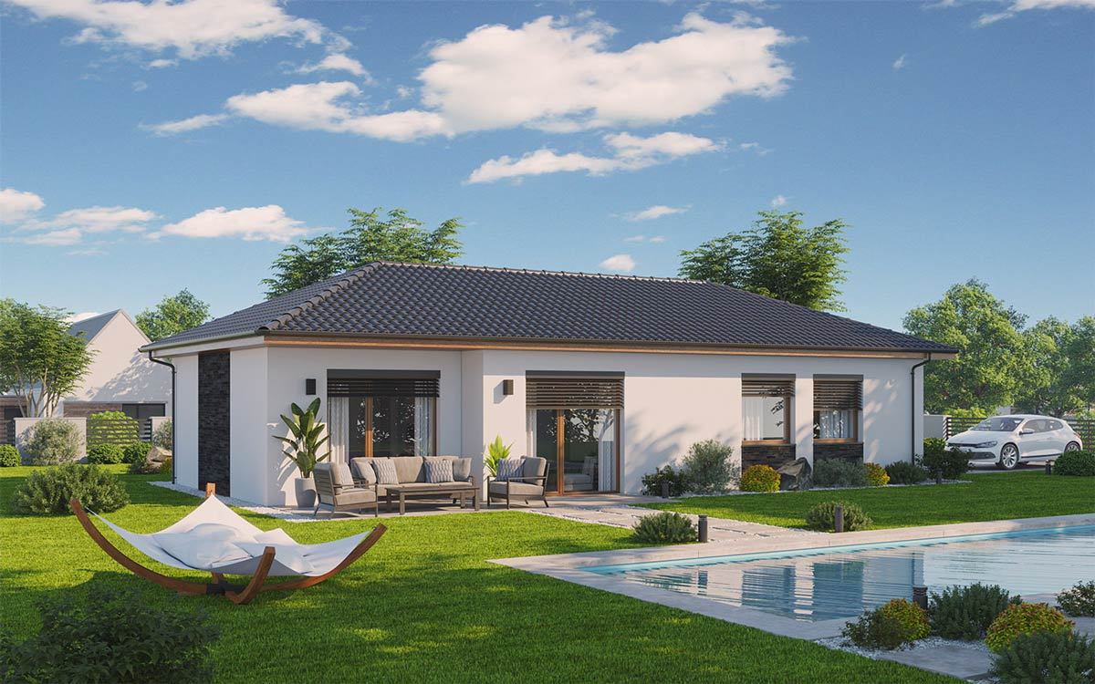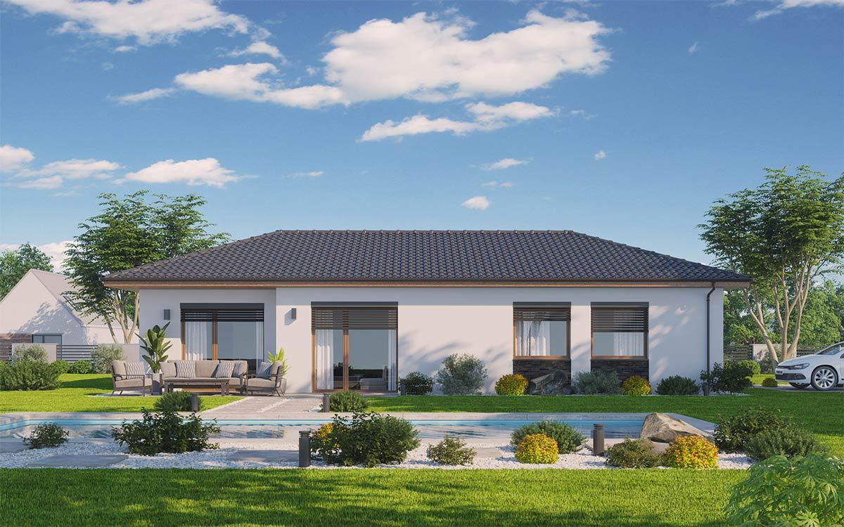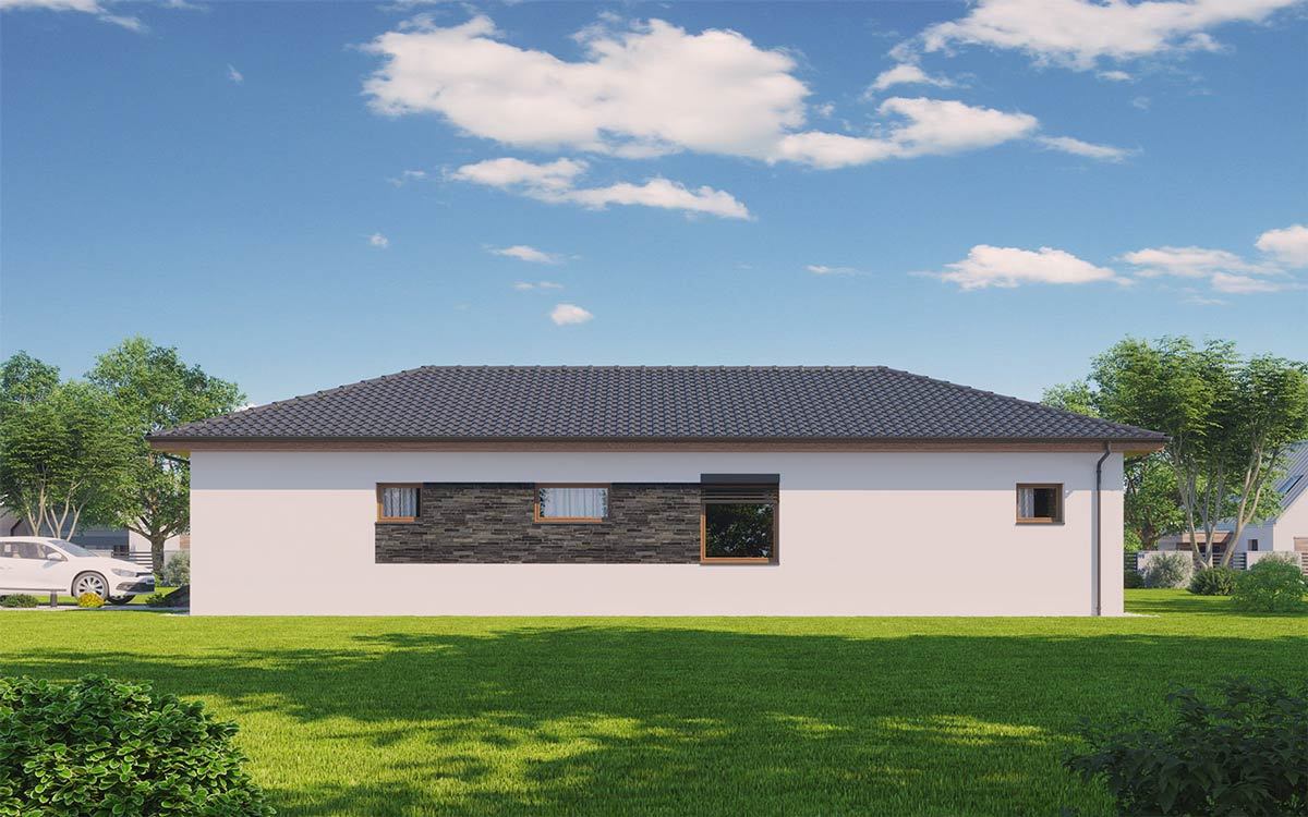 Jednopodlažní dům o dispozici 3 + kk + g je vhodným řešením pro rodiny uvažující o jednom dítěti či jako řešení bydlení na stáří. Dům má půdorys tvaru L, kdy je dispozičně dělen na společenskou a klidovou zónu.