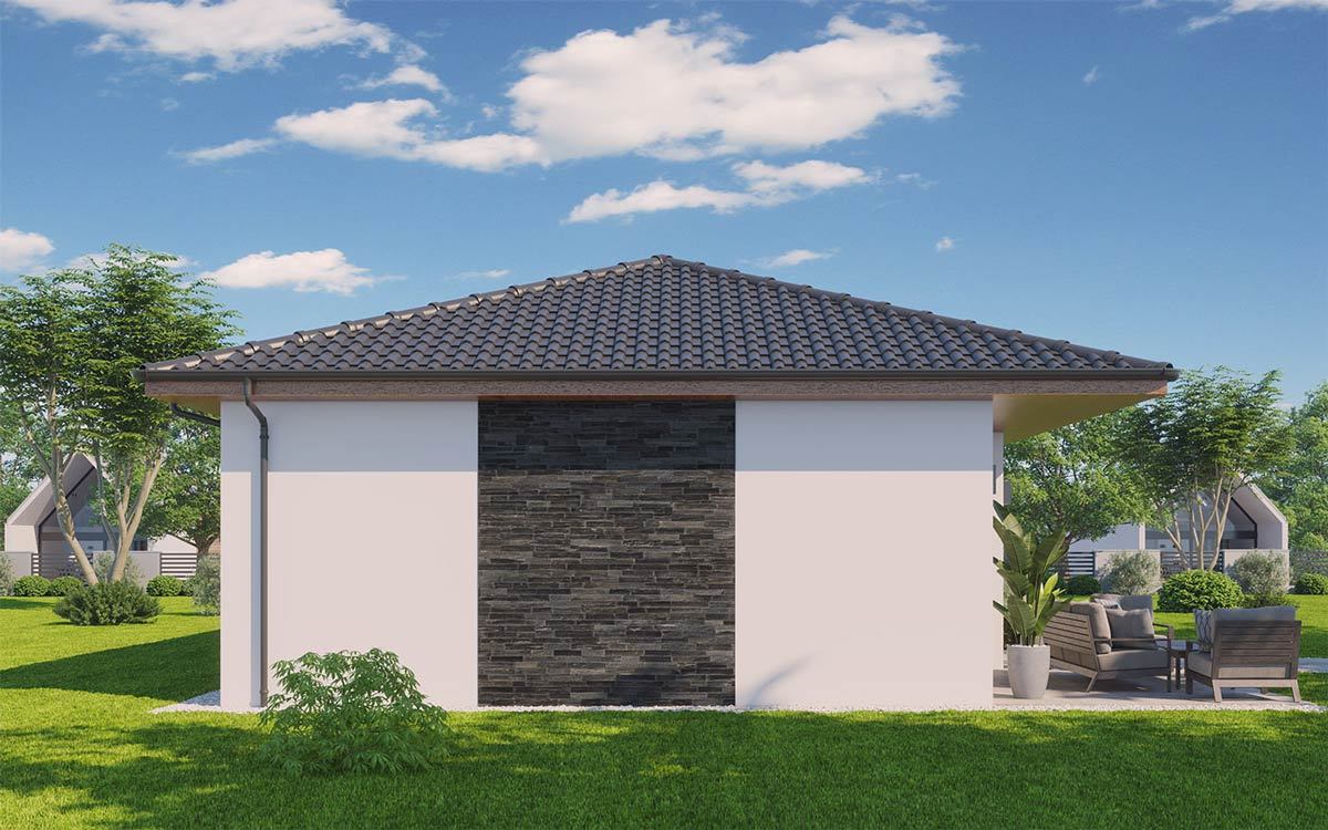 Tento bungalov díky originálnímu řešení střechy vybočuje ze stereotypu a nabízí praktické a zároveň úsporné bydlení tříčlenné rodině nebo dvojici. Bude dobře vypadat ve městě i na venkově. K výhodám patří prostorné zádveří, vyvážená velikost místností, přehledná dispozice, příjemná bude jistě i krytá terasa.