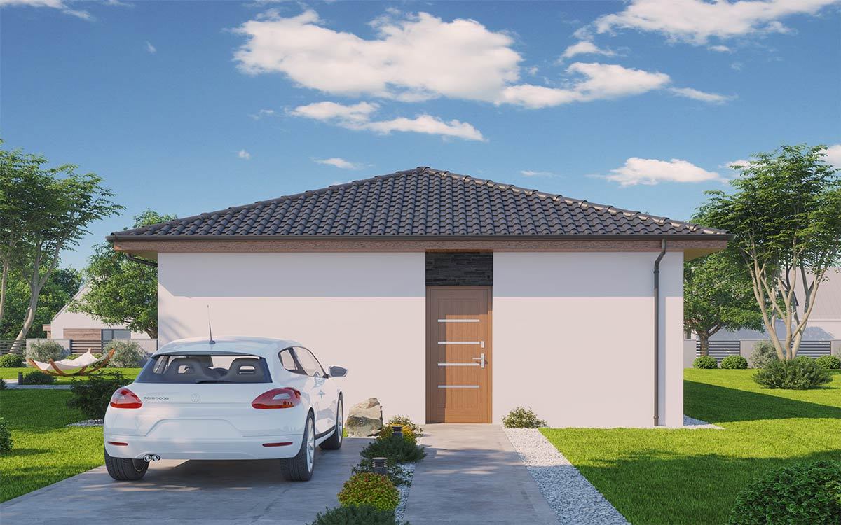 Dispozice domu se hodí jak pro starší klienty, pro které by byl větší obytný prostor již nadbytečný, tak pro mladou rodinu s jedním dítětem. Hlavní část domu je oddělena od garáže vstupním prostorem. Tento je však plně krytý střechou, a vytváří tak dokonalé zázemí pro vstup nejen do domu, ale i do zahrady.