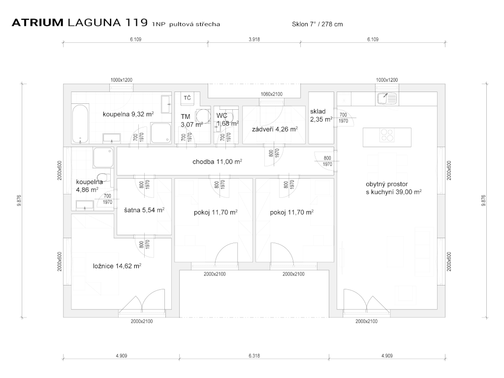 Líbilo by se vám, kdybyste mohli z každého pokoje vyjít ven na terasu? Přesně toto přání splňuje moderní dřevostavba s názvem Laguna 119. Promyšlený půdorys domu nabízí komfort i náročnému uživateli. Větším luxusem se může chlubit například ložnice, která má vlastní šatnu a koupelnu s WC. Druhá trochu větší koupelna je vybavená vanou i sprchou! V kuchyni je k dispozici potřebný skladovací prostor, kde má paní domu po ruce praktickou spíž. Proto tento dům ve tvaru „U“ jistě najde svého majitele i mezi náročnějšími zájemci.