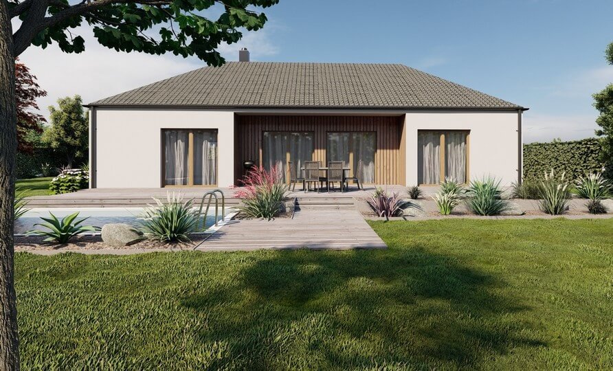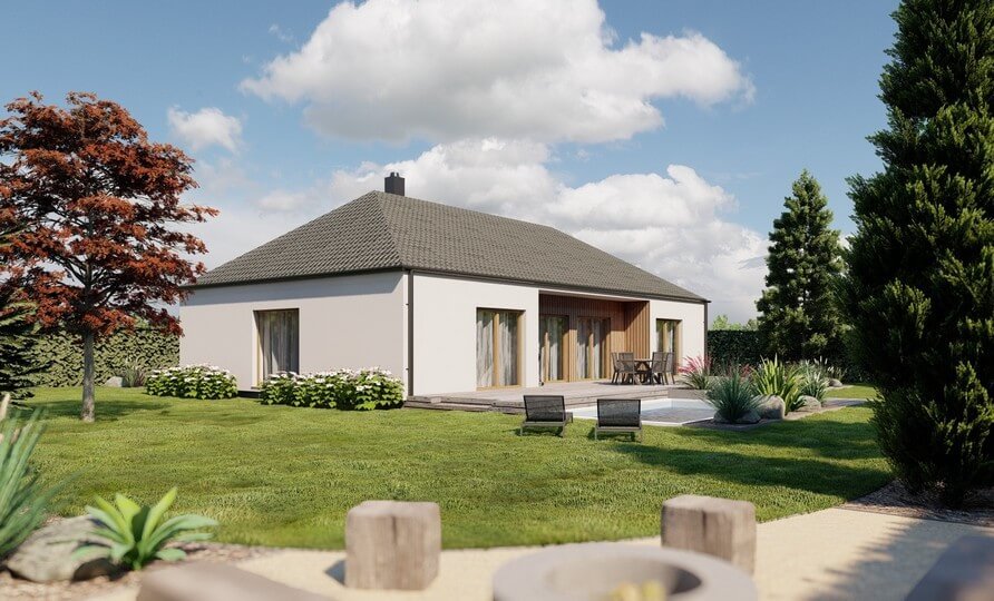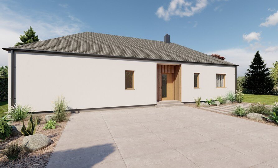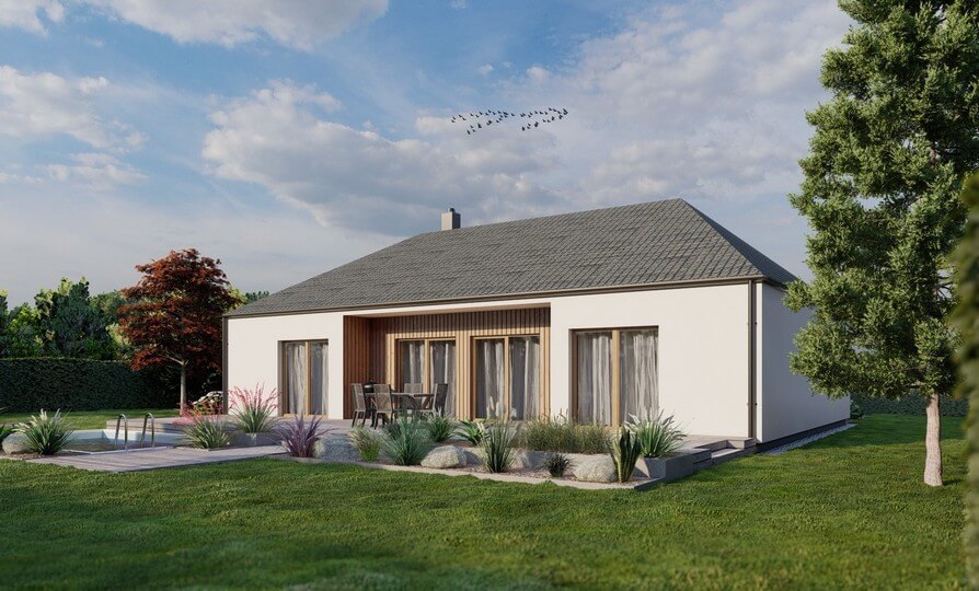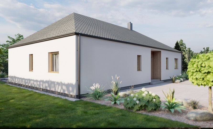 Jednoduchý moderní dům bude dobře vypadat v nové i starší zástavbě. Vyžaduje delší obdélníkový nebo velký čtvercový pozemek. Poskytne pohodlné bezbariérové rodinné bydlení, má velký společný obývací prostor, průchozí do ložnicové části. Z každého pokoje se dá vyjít přímo na zahradu. Výhodou je i úsporný provoz.