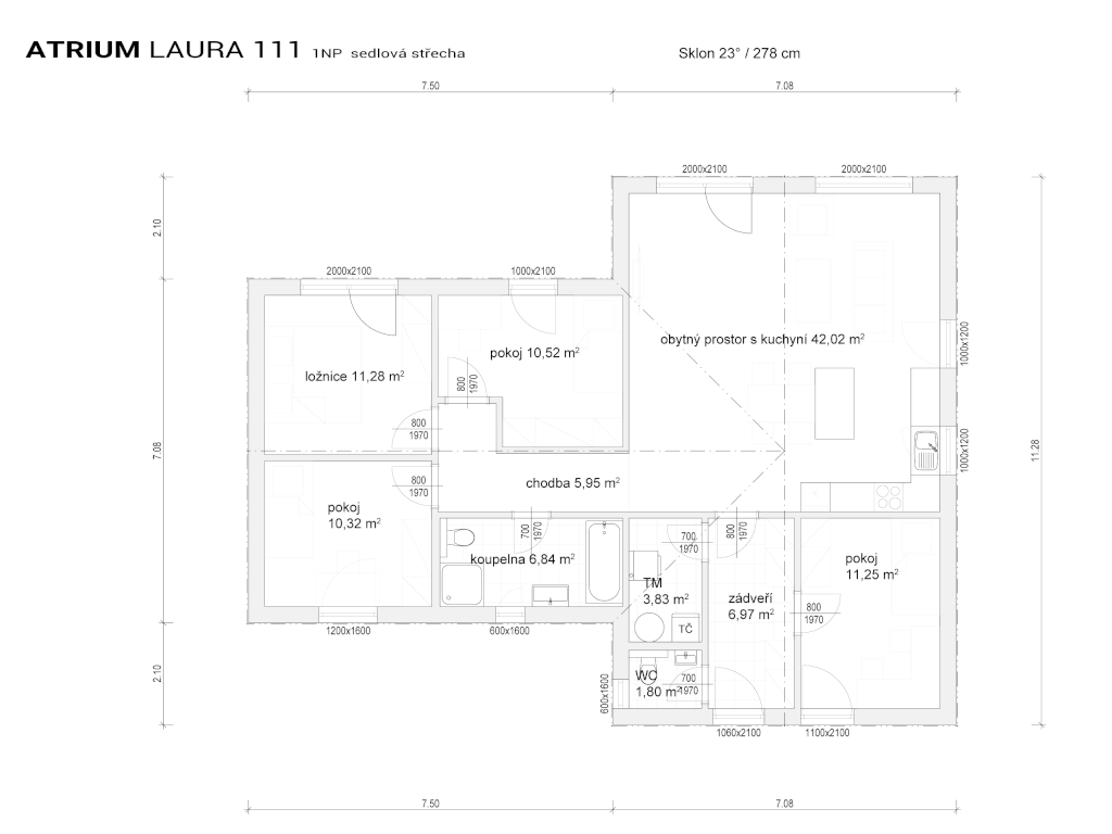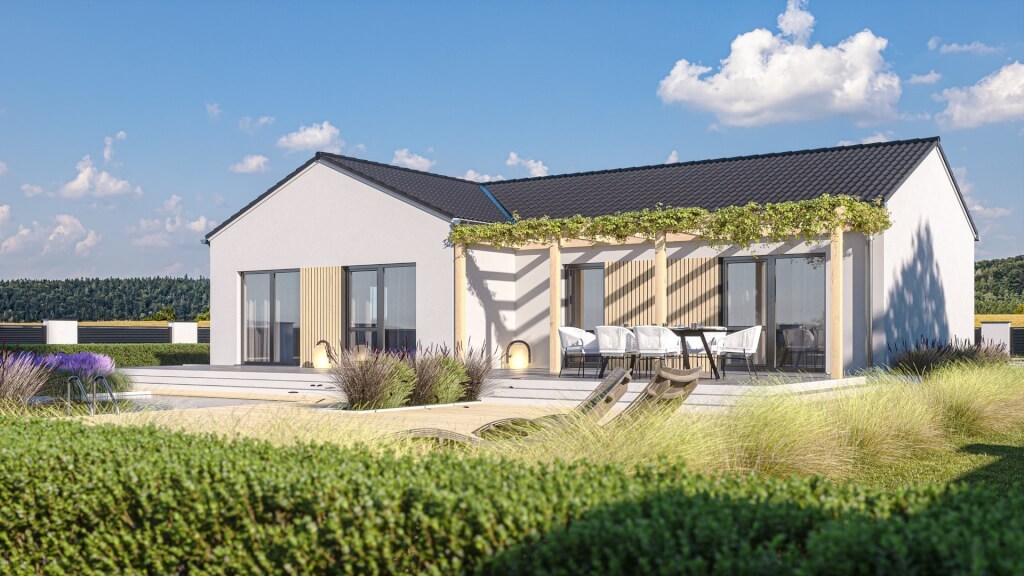 Bungalov s tradiční sedlovou střechou, ale moderním designem bude dobře působit v jakémkoliv prostředí. Poskytne pohodlné bezbariérové bydl... ení čtyřčlenné rodině, všechny pokoje lze přímo propojit se zahradou. Vzhledem k půdorysu ve tvaru T si vyžádá větší pozemek.