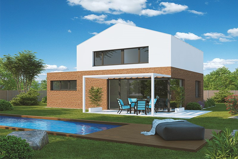 Dům postavený ve volné krajině elegantně spojuje tradiční tvar venkovského stavení s moderním designem. Má společnou obývací část v přízemí a ložnice v podkroví. Díky zvýšené nadezdívce je i pod šikmými stropy dost místa a velká okna dávají hodně světla. Odolná konstrukce z tvárnic