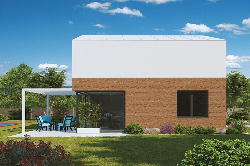 Jedná se o dvoupodlažní dům o dispozici 5 + kk s plochou střechou. Dobře vyřešená dispozice poskytne velkorysý prostor pro rodinné soužití i pro návštěvy a druhé nadzemní podlaží pak poskytuje naprosté soukromí pro každý z pokojů. V druhém nadzemním patře se nacházejí dva pokoje, koupelna a ložnice se svou vlastní koupelnou. Dalším skvělým prvkem je venkovní pergola a kryté parkování pro auta.