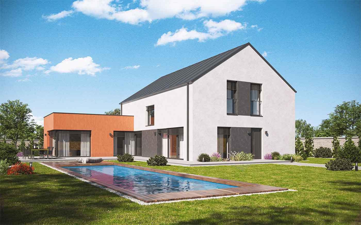 Díky možnosti zvolit různý tvar střechy dům dobře zapadne do městského i venkovského prostředí. Dispozice nabízí nadstandardní komfort pro až pětičlennou rodinu – velké pokoje a pohodlné zázemí včetně potřebného úložného prostoru.