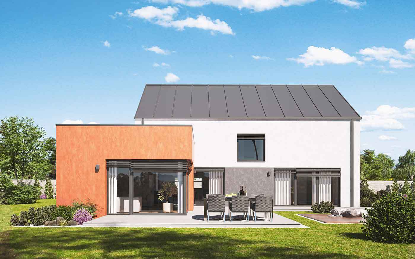 Dům dobře zapadne do města i na venkov a uspokojí nároky na moderní bydlení pro čtyřčlennou rodinu. Velký společný obývací prostor v přízemí je promyšleně rozdělen na kuchyňskou část a sezení, ke kladům patří také chráněná rohová terasa, pohodlné zázemí a dostatek úložného prostoru.