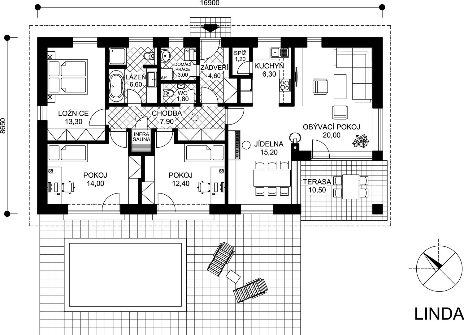 Linda je přívětivý přízemní rodinný dům střední velikostní kategorie obdélníkového půdorysu se sedlovou střechou o sklonu 22°. Přesah střechy chrání příjemnou terasu.
