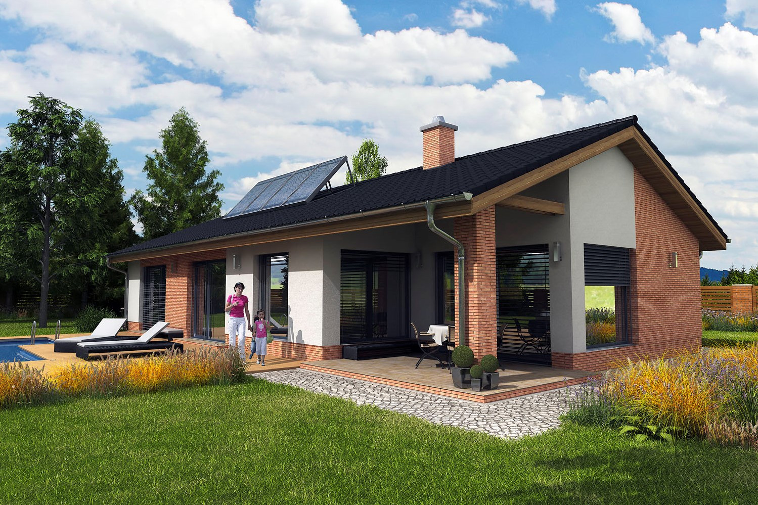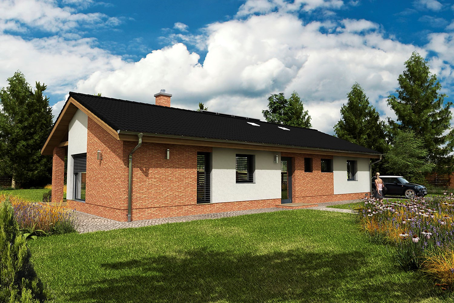 Moderní úsporný dům nabízí praktické bydlení za přijatelnou cenu. Centrem je obývací pokoj s kuchyní a prosklenou stěnou do zahrady. Rozděluje dispozici na dvě části – apartmá rodičů a zónu s dětskými pokoji a hlavním vstupem. Obě zóny mají vlastní zázemí a navzájem se neruší.