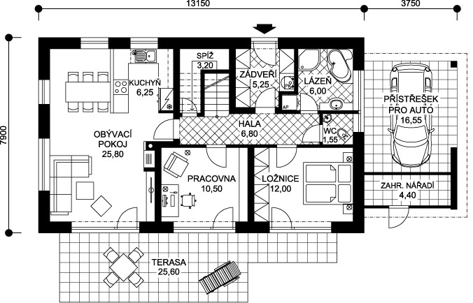 Dům dobře zapadne do města i na venkov a uspokojí nároky na moderní bydlení pro čtyřčlennou rodinu. Velký společný obývací prostor v přízemí je promyšleně rozdělen na kuchyňskou část a sezení, ke kladům patří také chráněná rohová terasa, pohodlné zázemí a dostatek úložného prostoru.