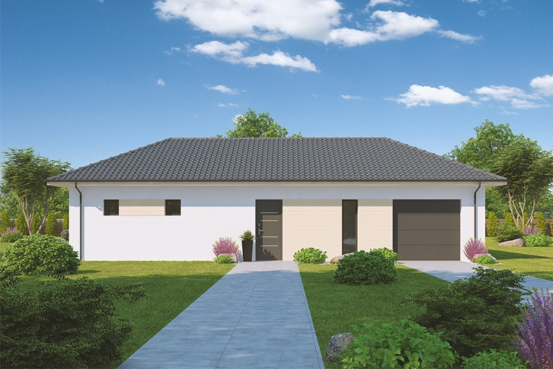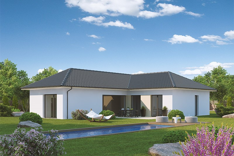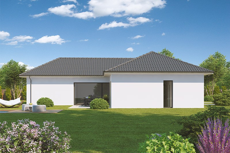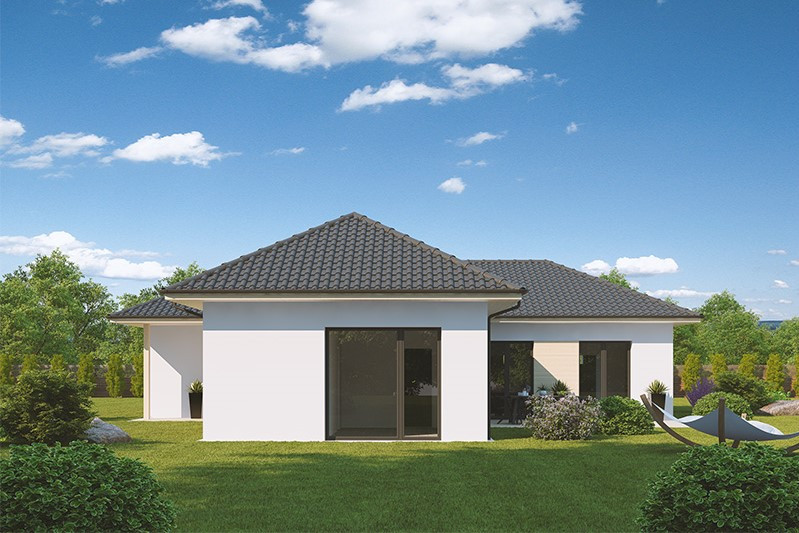 Bungalov s dispozicí ve tvaru písmene L se řadí mezi nejoblíbenější typy rodinných domů u nás. Oddělená denní a noční zóna s vlastním zázemím zajišťují pohodlný provoz domácnosti. K výhodám patří i rohová terasa a integrovaná garáž propojená se zádveřím.