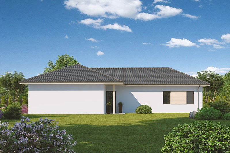 Jedná se o pohodlné bezbariérové bydlení za výhodnou cenu pro čtyřčlennou rodinu. Účelná dispozice umožňuje vytvořit chráněnou rohovou terasu. Ze zádveří se přes chodbu vstupuje přímo do společné obývací části, která je rozdělena na kuchyň s jídelnou a obývací pokoj s výstupem na terasu. Dům je určen pro rovinatý pozemek, doporučuje se, aby hlavní hřeben střechy byl rovnoběžný s osou přístupové komunikace.