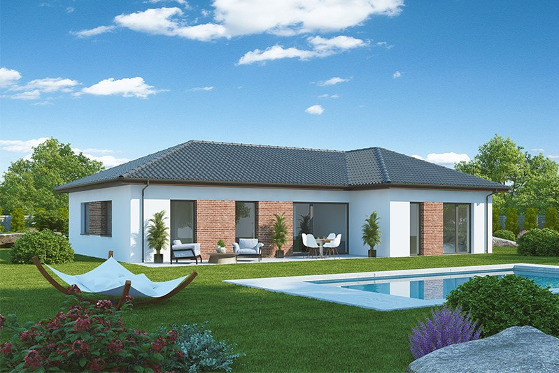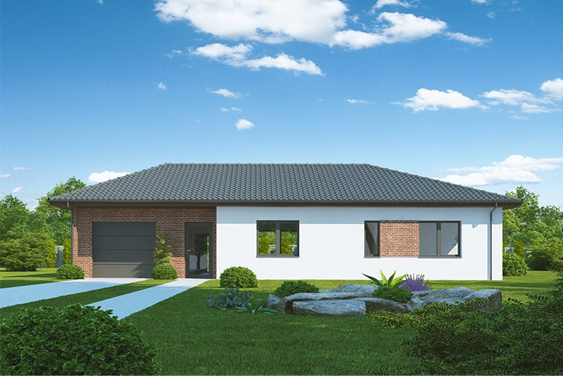 Jednopodlažní dům o dispozici 3 + kk + g je vhodným řešením pro rodiny uvažující o jednom dítěti či jako řešení bydlení na stáří. Dům má půdorys tvaru L, kdy je dispozičně dělen na společenskou a klidovou zónu.