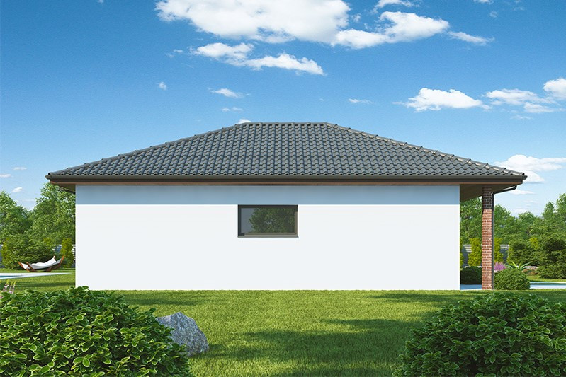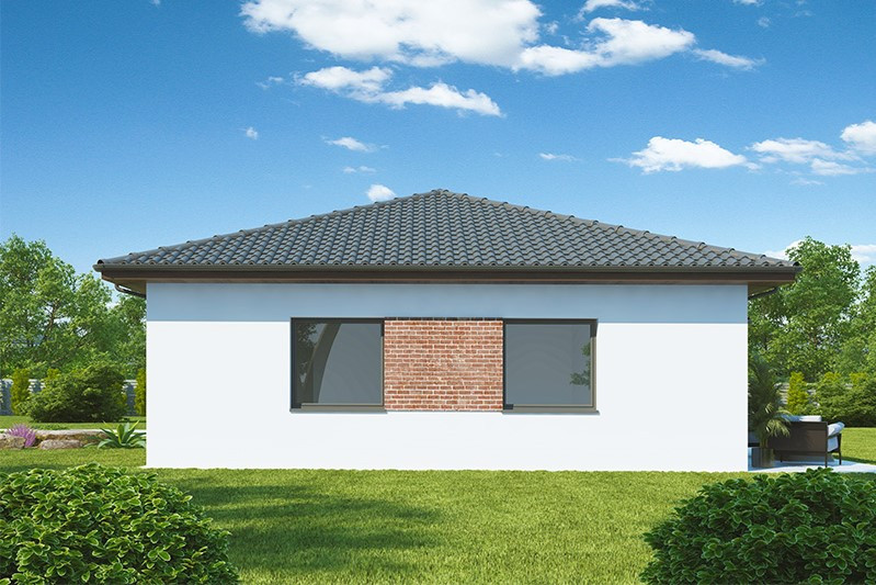 Bungalov s charakteristickou valbovou střechou je určen pro praktické a úsporné bydlení čtyřčlenné rodiny. Má přehlednou dispozici, k jeho výhodám patří krytý vstup, krytá terasa, pohodlná kuchyň. Pro rodinu se dvěma dětmi by bylo třeba více úložného prostoru.