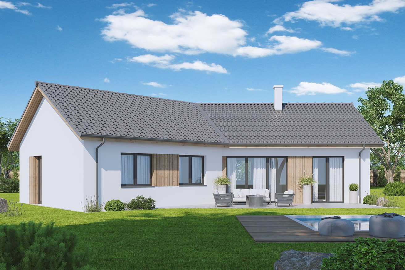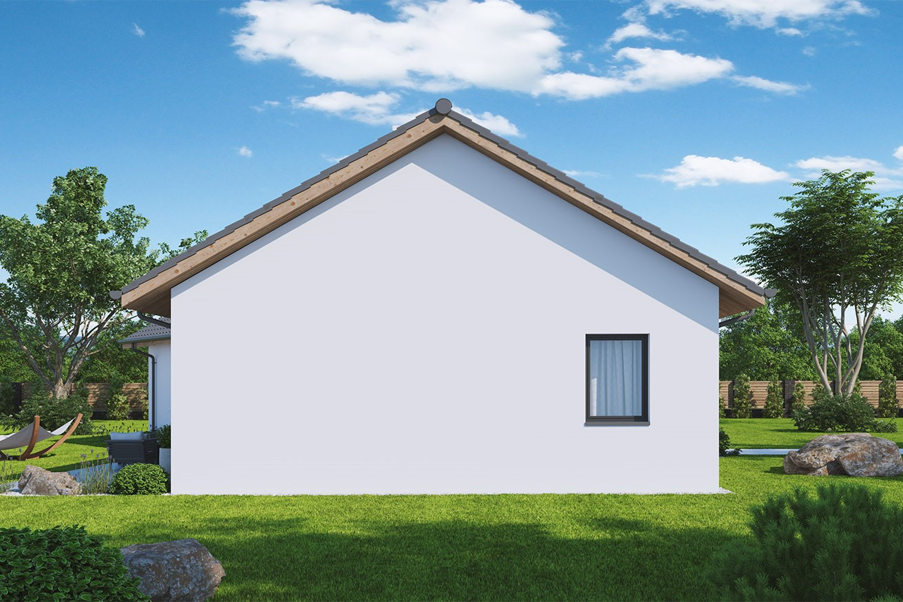 Jednopodlažní dům o dispozici 3 + kk + g je vhodným řešením pro rodiny uvažující o jednom dítěti či jako řešení bydlení na stáří. Dům má půdorys tvaru L, kdy je dispozičně dělen na společenskou a klidovou zónu.