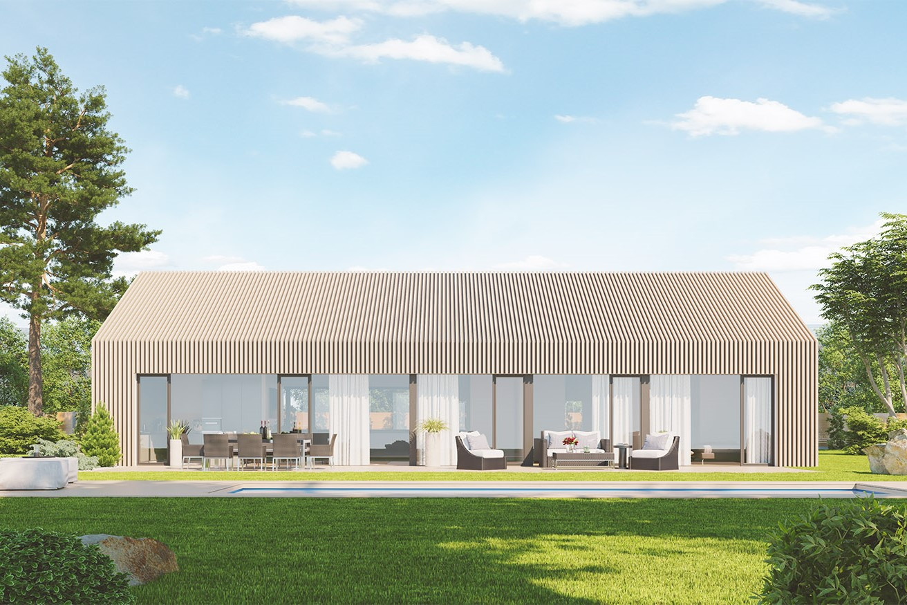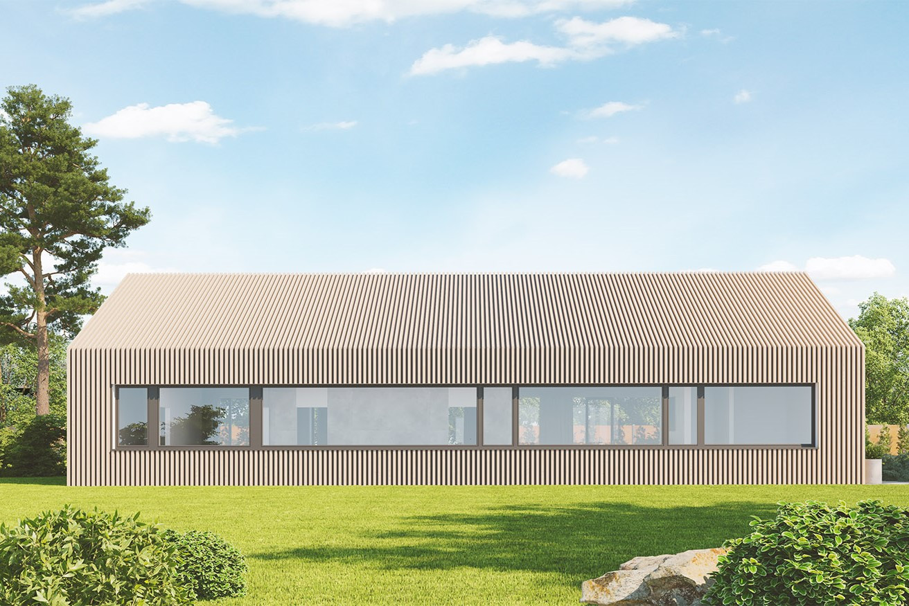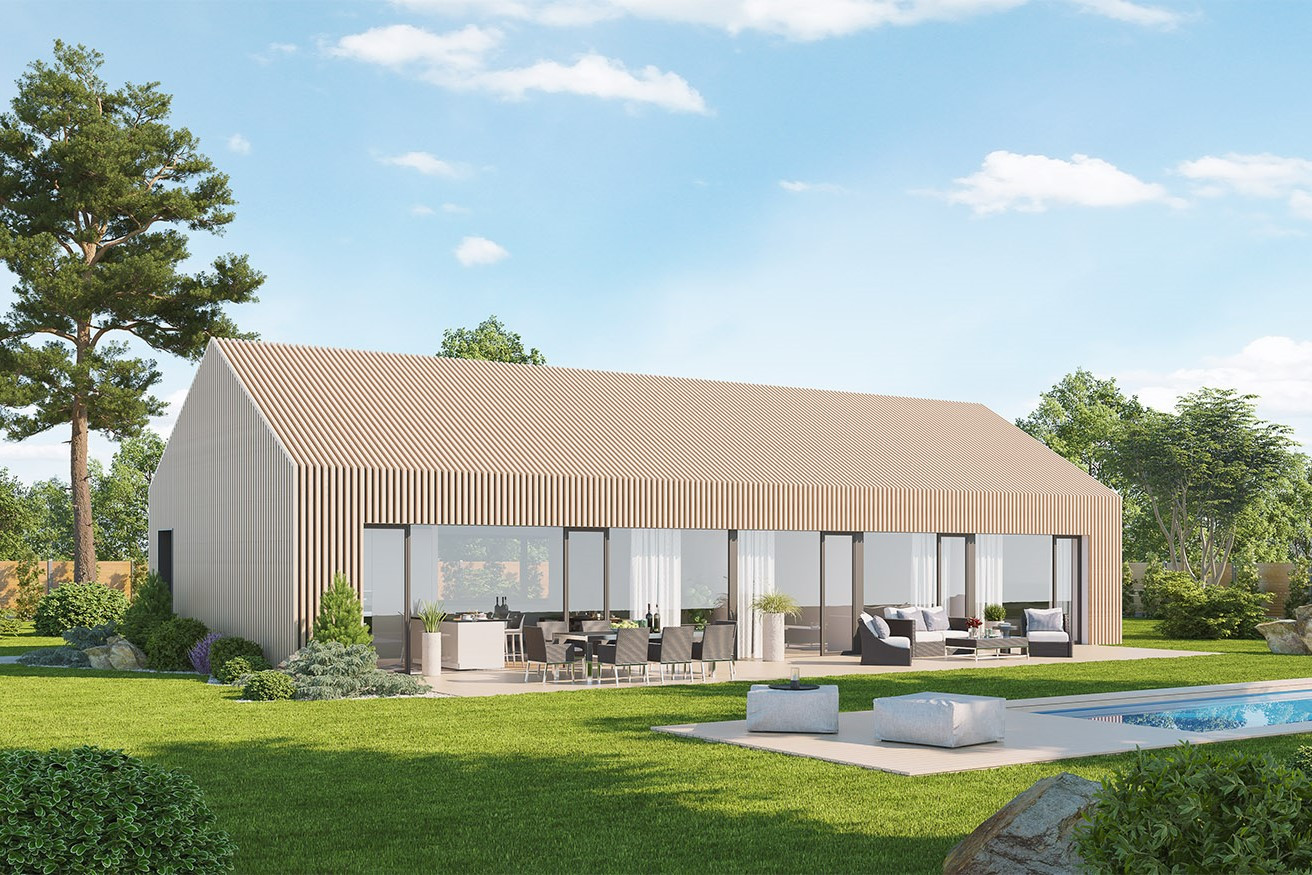 Originální moderní bungalov je vhodný především do nové zástavby a poskytne nadstandardní komfort čtyřčlenné rodině. Architektura zaujme velkým prosklením, zaoblenými nárožími a velkorysým společným obývacím prostorem. Interiér se maximálně propojuje se zahradou, z každého pokoje se dá vyjít přímo ven.
