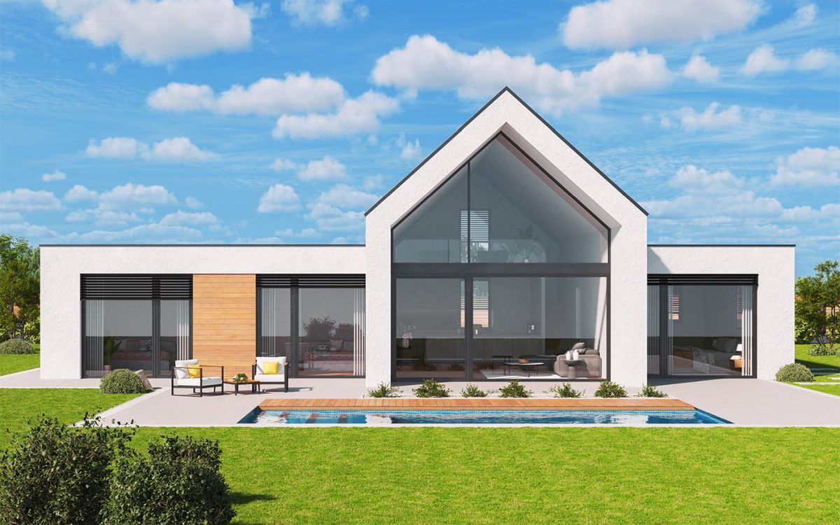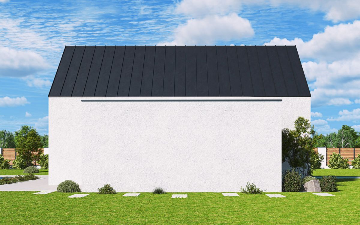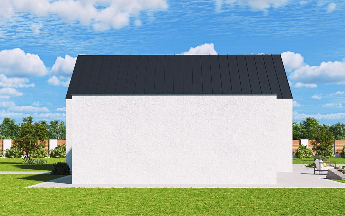Moderní úsporný dům nabízí praktické bydlení za přijatelnou cenu. Centrem je obývací pokoj s kuchyní a prosklenou stěnou do zahrady. Rozděluje dispozici na dvě části – apartmá rodičů a zónu s dětskými pokoji a hlavním vstupem. Obě zóny mají vlastní zázemí a navzájem se neruší.