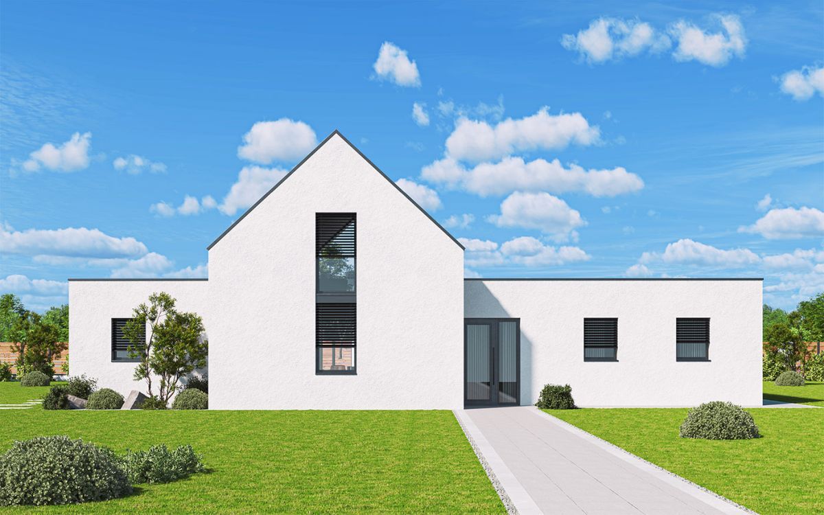 Jednopodlažní dům o dispozici 3 + kk + g je vhodným řešením pro rodiny uvažující o jednom dítěti či jako řešení bydlení na stáří. Dům má půdorys tvaru L, kdy je dispozičně dělen na společenskou a klidovou zónu.