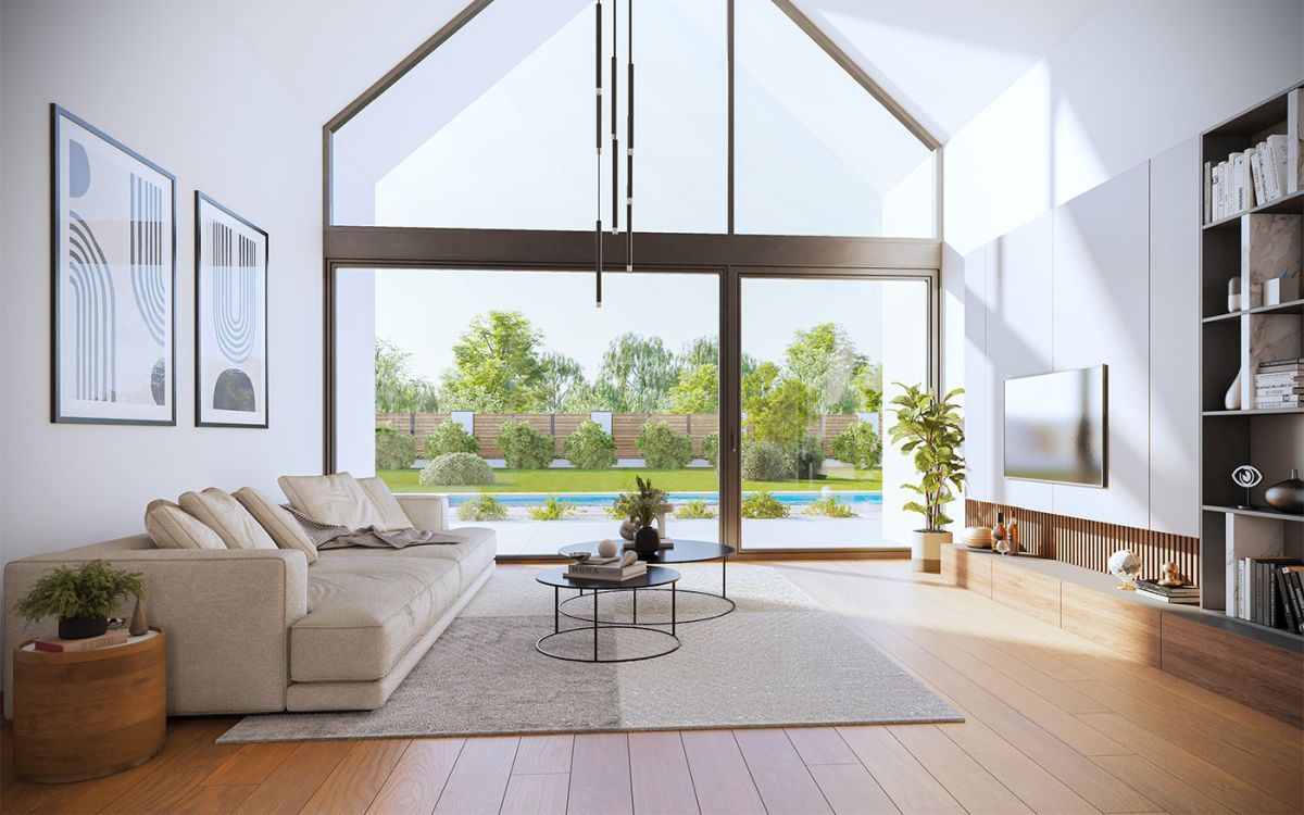 Středem domu je prostorný obývací pokoj zahrnující také kuchyňskou linkou s ostrůvkem. Díky celoprosklené stěně orientované do zahrady je obývací pokoj vizuálně propojen s venkovní terasou. Umístění dětských pokojů a ložnice symetricky na opačných stranách obývacího pokoje poskytuje soukromí všem členů rodiny. Ložnice má vlastní koupelnu přístupnou z šatny. Plochá střecha v kombinaci s dřevěným stíněním terasy propůjčuje domu moderní vzhled. Vzdušně navržené obytné místnosti a velké prosklené plochy zajišťují, že se v tomto domě budete vždy cítit skvěle.