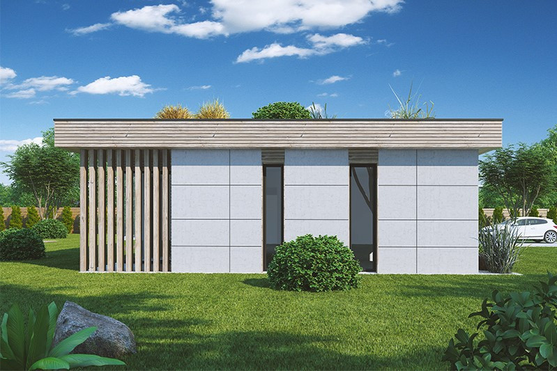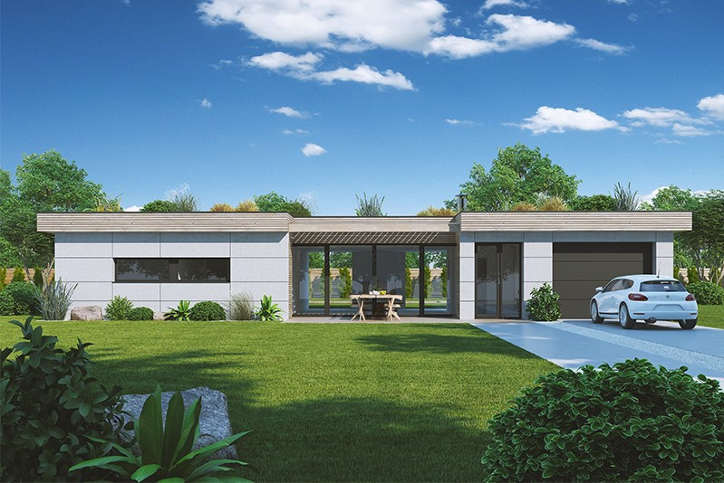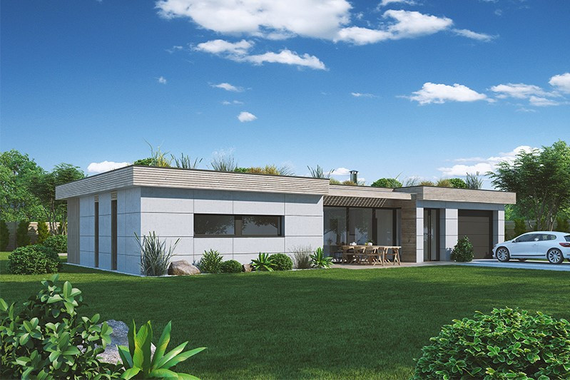 Moderní úsporný dům nabízí praktické bydlení za přijatelnou cenu. Centrem je obývací pokoj s kuchyní a prosklenou stěnou do zahrady. Rozděluje dispozici na dvě části – apartmá rodičů a zónu s dětskými pokoji a hlavním vstupem. Obě zóny mají vlastní zázemí a navzájem se neruší.