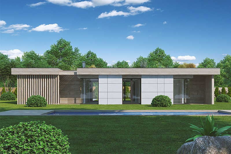 Středem domu je prostorný obývací pokoj zahrnující také kuchyňskou linkou s ostrůvkem. Díky celoprosklené stěně orientované do zahrady je obývací pokoj vizuálně propojen s venkovní terasou. Umístění dětských pokojů a ložnice symetricky na opačných stranách obývacího pokoje poskytuje soukromí všem členů rodiny. Ložnice má vlastní koupelnu přístupnou z šatny. Plochá střecha v kombinaci s dřevěným stíněním terasy propůjčuje domu moderní vzhled. Vzdušně navržené obytné místnosti a velké prosklené plochy zajišťují, že se v tomto domě budete vždy cítit skvěle.