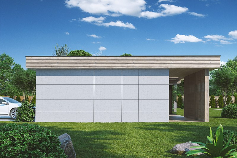 Součástí domu je opěrná zeď, tvořící základní prvek celé idey domu. Opěrná zeď, včetně dvojice sloupů, vytváří prostor pro kryté stání dvou automobilů nebo místo pro zastřešené posezení.