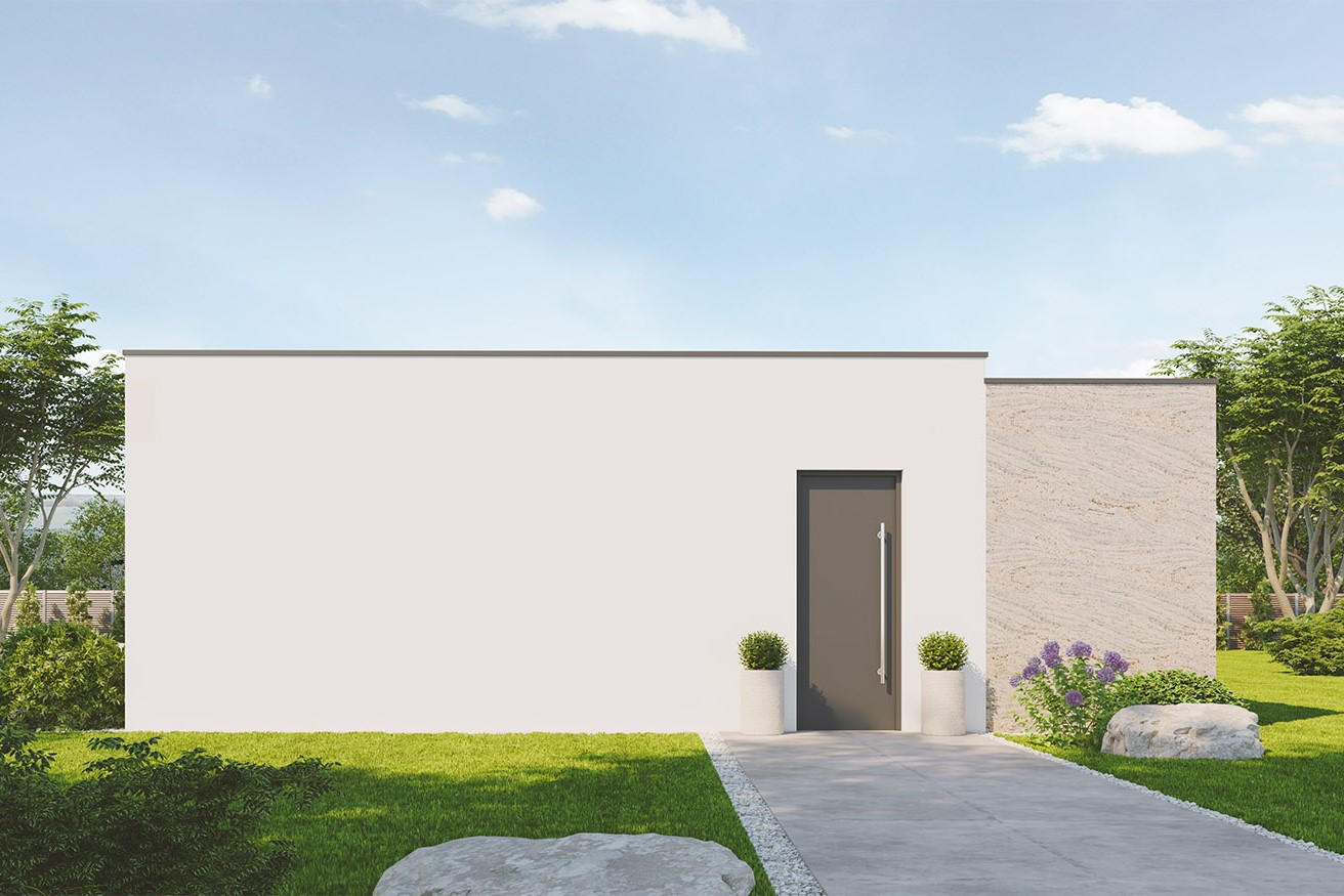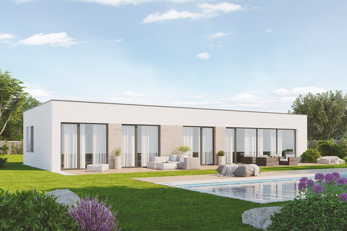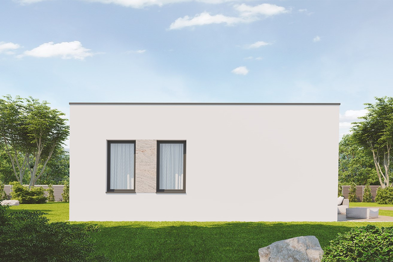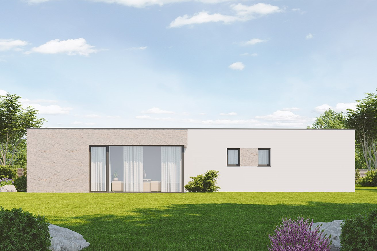 Bungalov s plochou střechou se vyznačuje příjemnou moderní architekturou s řadou francouzských oken a vzdušným interiérem. Poskytne komfortn... bezbariérové bydlení čtyřčlenné rodině s veškerým potřebným zázemím. Velká pracovna hned u vchodu umožňuje práci z domova. Dům je vhodný především do nové zástavby, na větší rovný pozemek. .
